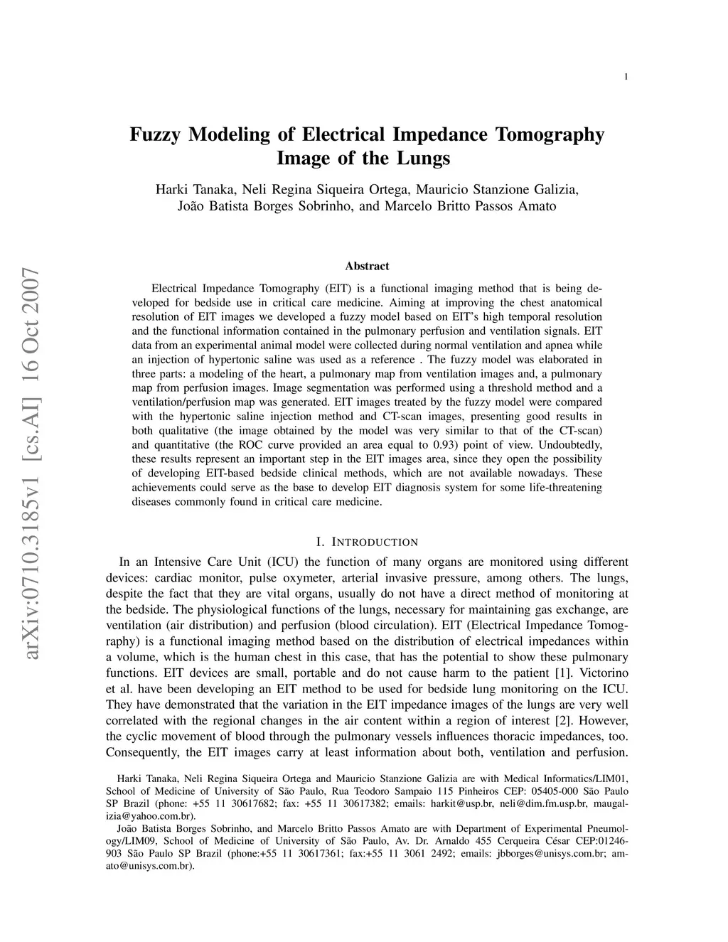 Electrical Impedance Tomography (EIT) is a functional imaging method that is being developed for bedside use in critical care medicine. Aiming at improving the chest anatomical resolution of EIT images we developed a fuzzy model based on EIT high temporal resolution and the functional information contained in the pulmonary perfusion and ventilation signals. EIT data from an experimental animal model were collected during normal ventilation and apnea while an injection of hypertonic saline was used as a reference . The fuzzy model was elaborated in three parts: a modeling of the heart, a pulmonary map from ventilation images and, a pulmonary map from perfusion images. Image segmentation was performed using a threshold method and a ventilation/perfusion map was generated. EIT images treated by the fuzzy model were compared with the hypertonic saline injection method and CT-scan images, presenting good results in both qualitative (the image obtained by the model was very similar to that of the CT-scan) and quantitative (the ROC curve provided an area equal to 0.93) point of view. Undoubtedly, these results represent an important step in the EIT images area, since they open the possibility of developing EIT-based bedside clinical methods, which are not available nowadays. These achievements could serve as the base to develop EIT diagnosis system for some life-threatening diseases commonly found in critical care medicine.