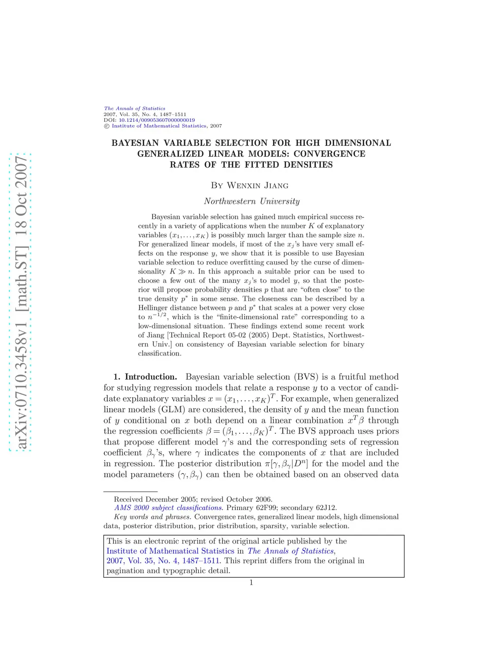 Bayesian variable selection has gained much empirical success recently in a variety of applications when the number of explanatory variables is possibly much larger than the sample size . For generalized linear models, if most of the 's have very small effects on the response , we show that it is possible to use Bayesian variable selection to reduce overfitting caused by the curse of dimensionality . In this approach a suitable prior can be used to choose a few out of the many 's to model , so that the posterior will propose probability densities that are ``often close'' to the true density in some sense. The closeness can be described by a Hellinger distance between and that scales at a power very close to , which is the ``finite-dimensional rate'' corresponding to a low-dimensional situation. These findings extend some recent work of Jiang [Technical Report 05-02 (2005) Dept. Statistics, Northwestern Univ.] on consistency of Bayesian variable selection for binary classification.