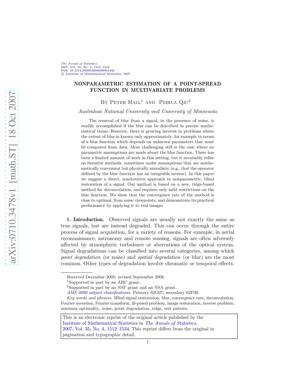 The removal of blur from a signal, in the presence of noise, is readily accomplished if the blur can be described in precise mathematical terms. However, there is growing interest in problems where the extent of blur is known only approximately, for example in terms of a blur function which depends on unknown parameters that must be computed from data. More challenging still is the case where no parametric assumptions are made about the blur function. There has been a limited amount of work in this setting, but it invariably relies on iterative methods, sometimes under assumptions that are mathematically convenient but physically unrealistic (e.g., that the operator defined by the blur function has an integrable inverse). In this paper we suggest a direct, noniterative approach to nonparametric, blind restoration of a signal. Our method is based on a new, ridge-based method for deconvolution, and requires only mild restrictions on the blur function. We show that the convergence rate of the method is close to optimal, from some viewpoints, and demonstrate its practical performance by applying it to real images.