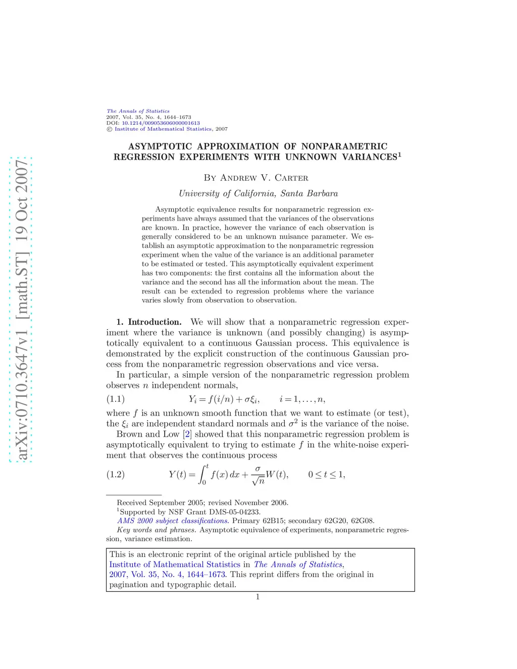 Asymptotic equivalence results for nonparametric regression experiments have always assumed that the variances of the observations are known. In practice, however the variance of each observation is generally considered to be an unknown nuisance parameter. We establish an asymptotic approximation to the nonparametric regression experiment when the value of the variance is an additional parameter to be estimated or tested. This asymptotically equivalent experiment has two components: the first contains all the information about the variance and the second has all the information about the mean. The result can be extended to regression problems where the variance varies slowly from observation to observation.