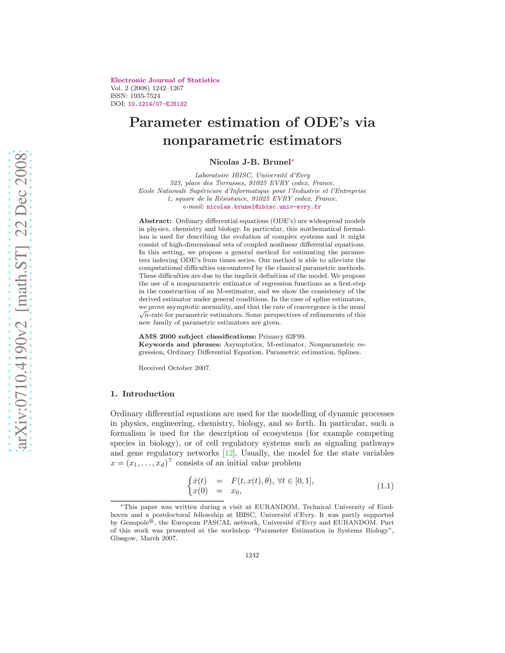 Ordinary differential equations (ODE's) are widespread models in physics, chemistry and biology. In particular, this mathematical formalism is used for describing the evolution of complex systems and it might consist of high-dimensional sets of coupled nonlinear differential equations. In this setting, we propose a general method for estimating the parameters indexing ODE's from times series. Our method is able to alleviate the computational difficulties encountered by the classical parametric methods. These difficulties are due to the implicit definition of the model. We propose the use of a nonparametric estimator of regression functions as a first-step in the construction of an M-estimator, and we show the consistency of the derived estimator under general conditions. In the case of spline estimators, we prove asymptotic normality, and that the rate of convergence is the usual -rate for parametric estimators. Some perspectives of refinements of this new family of parametric estimators are given.