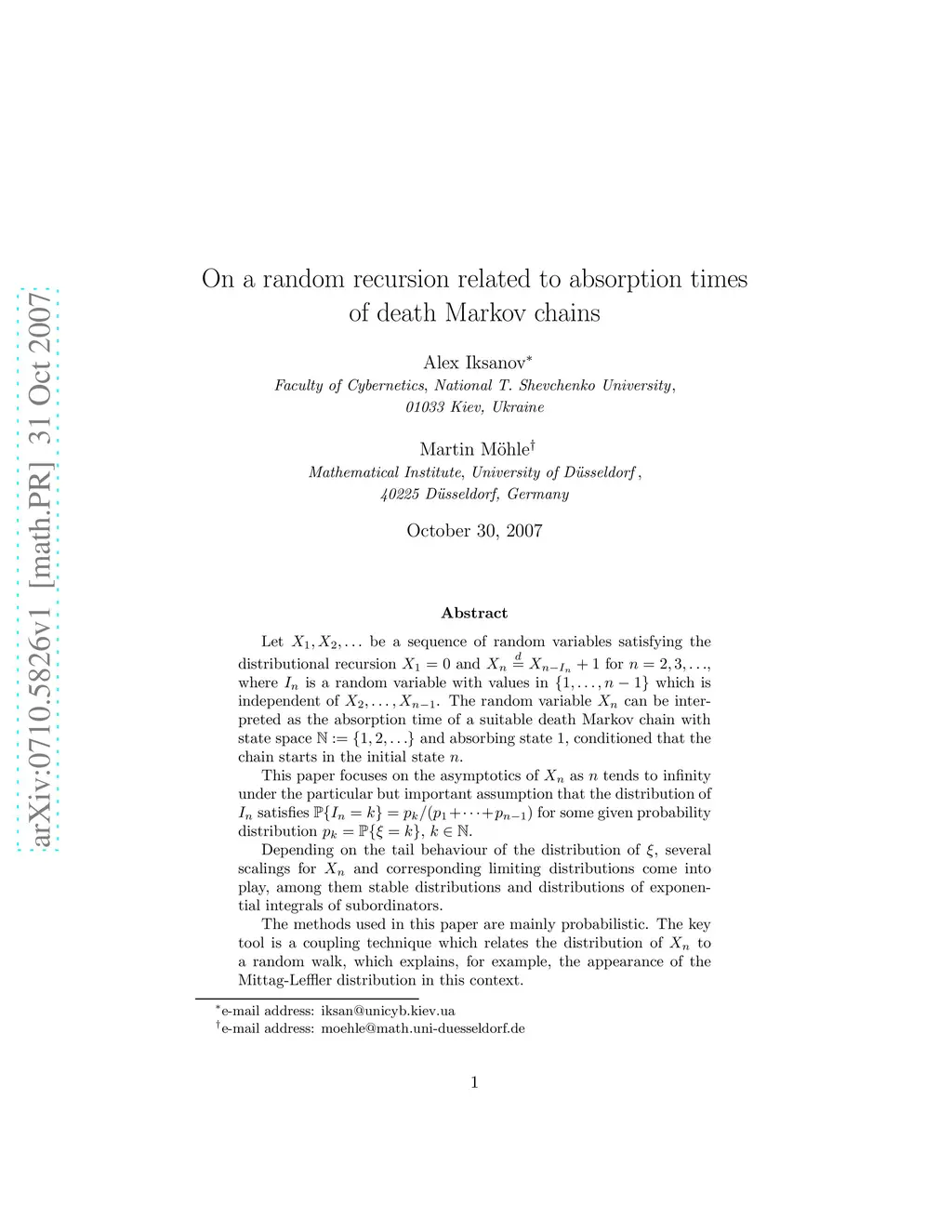 Let be a sequence of random variables satisfying the distributional recursion and for , where is a random variable with values in which is independent of . The random variable can be interpreted as the absorption time of a suitable death Markov chain with state space and absorbing state 1, conditioned that the chain starts in the initial state . This paper focuses on the asymptotics of as tends to infinity under the particular but important assumption that the distribution of satisfies for some given probability distribution , . Depending on the tail behaviour of the distribution of , several scalings for and corresponding limiting distributions come into play, among them stable distributions and distributions of exponential integrals of subordinators. The methods used in this paper are mainly probabilistic. The key tool is a coupling technique which relates the distribution of to a random walk, which explains, for example, the appearance of the Mittag-Leffler distribution in this context. The results are applied to describe the asymptotics of the number of collisions for certain beta-coalescent processes.