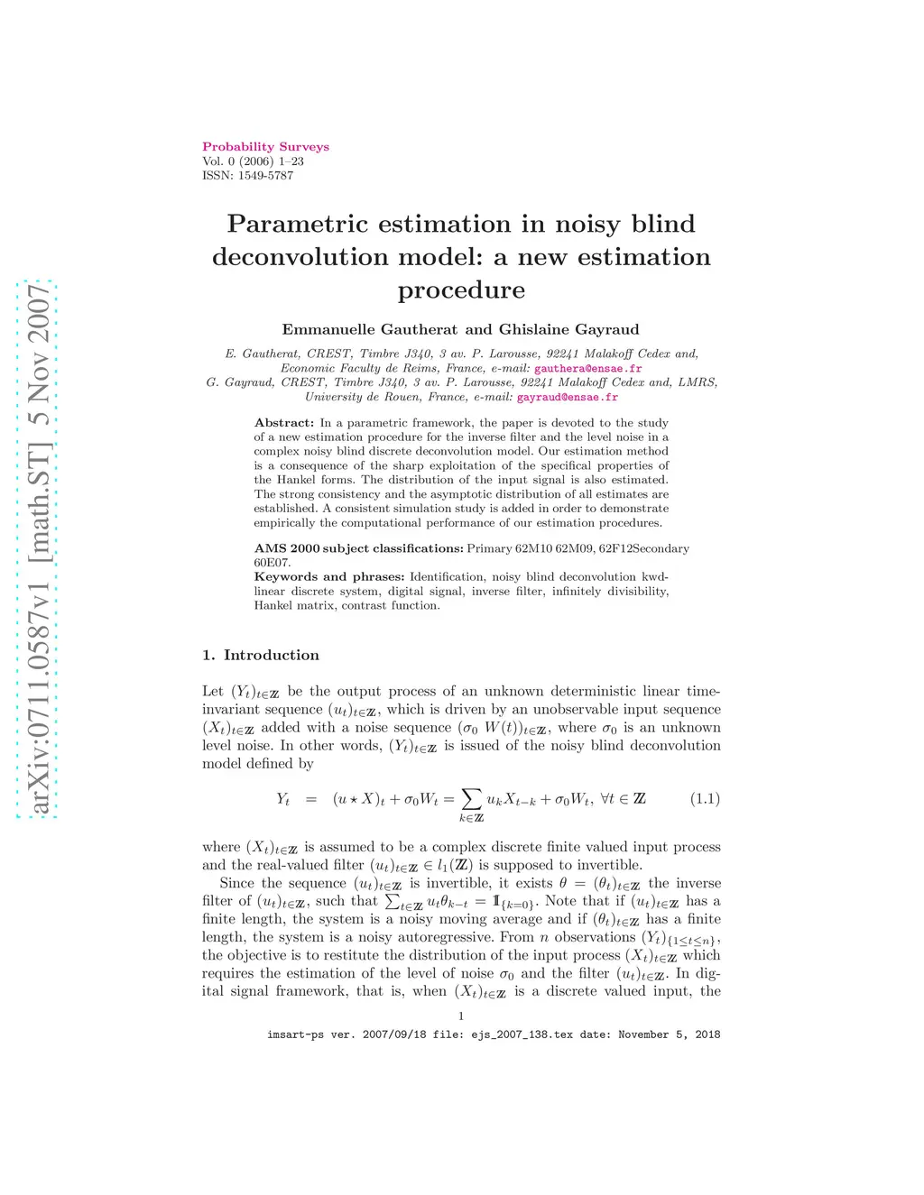 Parametric estimation in noisy blind deconvolution model: a new