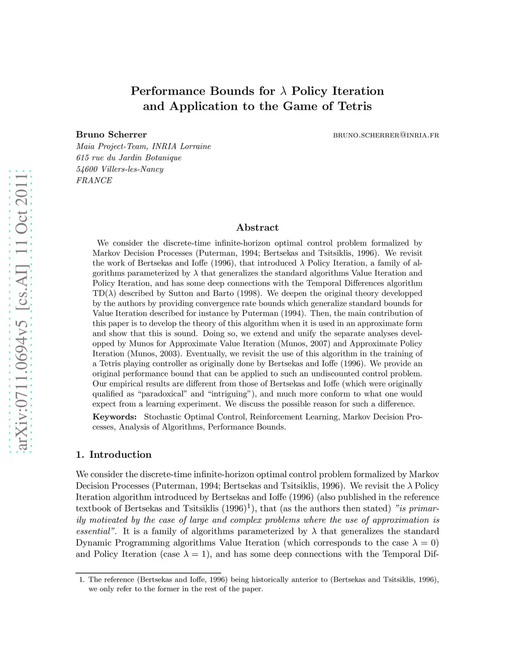 We consider the discrete-time infinite-horizon optimal control problem formalized by Markov Decision Processes. We revisit the work of Bertsekas and Ioffe, that introduced Policy Iteration, a family of algorithms parameterized by that generalizes the standard algorithms Value Iteration and Policy Iteration, and has some deep connections with the Temporal Differences algorithm TD() described by Sutton and Barto. We deepen the original theory developped by the authors by providing convergence rate bounds which generalize standard bounds for Value Iteration described for instance by Puterman. Then, the main contribution of this paper is to develop the theory of this algorithm when it is used in an approximate form and show that this is sound. Doing so, we extend and unify the separate analyses developped by Munos for Approximate Value Iteration and Approximate Policy Iteration. Eventually, we revisit the use of this algorithm in the training of a Tetris playing controller as originally done by Bertsekas and Ioffe. We provide an original performance bound that can be applied to such an undiscounted control problem. Our empirical results are different from those of Bertsekas and Ioffe (which were originally qualified as "paradoxical" and "intriguing"), and much more conform to what one would expect from a learning experiment. We discuss the possible reason for such a difference.