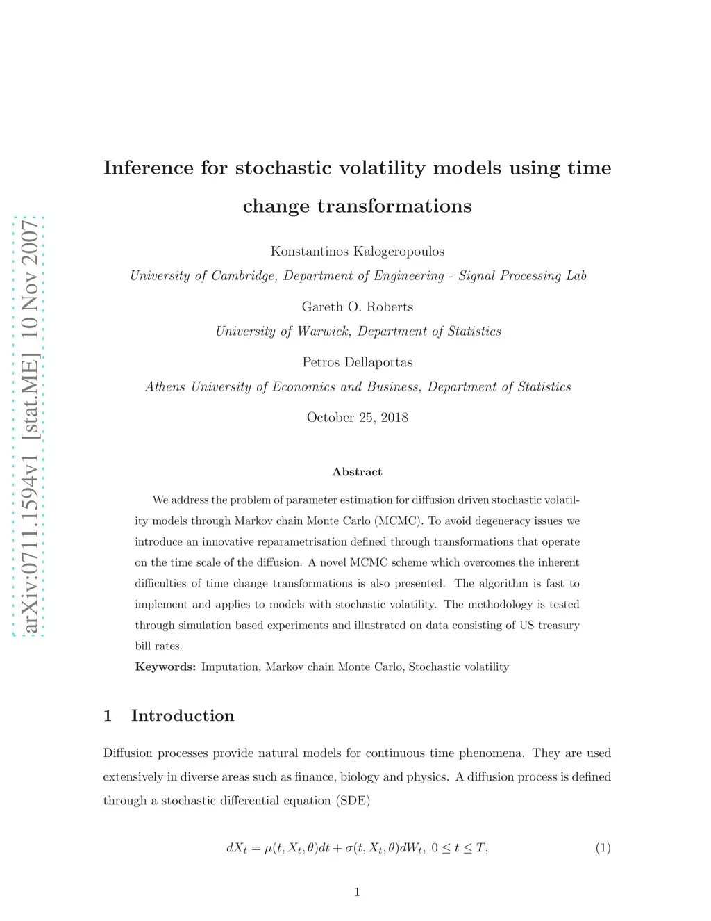 We address the problem of parameter estimation for diffusion driven stochastic volatility models through Markov chain Monte Carlo (MCMC). To avoid degeneracy issues we introduce an innovative reparametrisation defined through transformations that operate on the time scale of the diffusion. A novel MCMC scheme which overcomes the inherent difficulties of time change transformations is also presented. The algorithm is fast to implement and applies to models with stochastic volatility. The methodology is tested through simulation based experiments and illustrated on data consisting of US treasury bill rates.