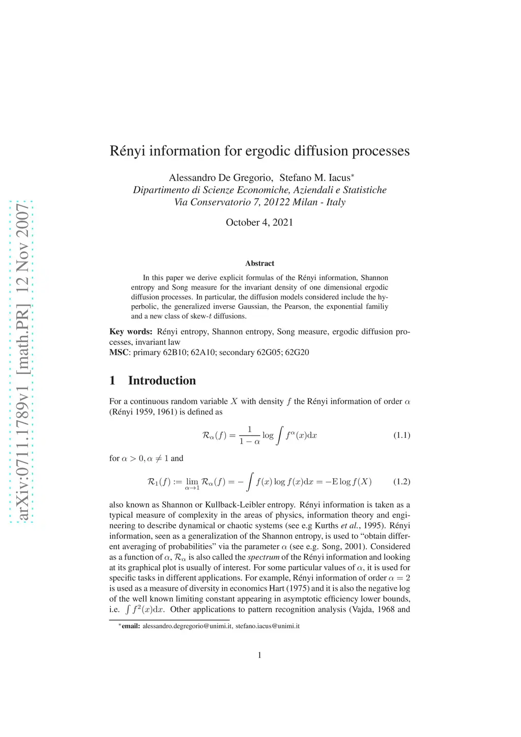In this paper we derive explicit formulas of the R\ényi information, Shannon entropy and Song measure for the invariant density of one dimensional ergodic diffusion processes. In particular, the diffusion models considered include the hyperbolic, the generalized inverse Gaussian, the Pearson, the exponential familiy and a new class of skew- diffusions.