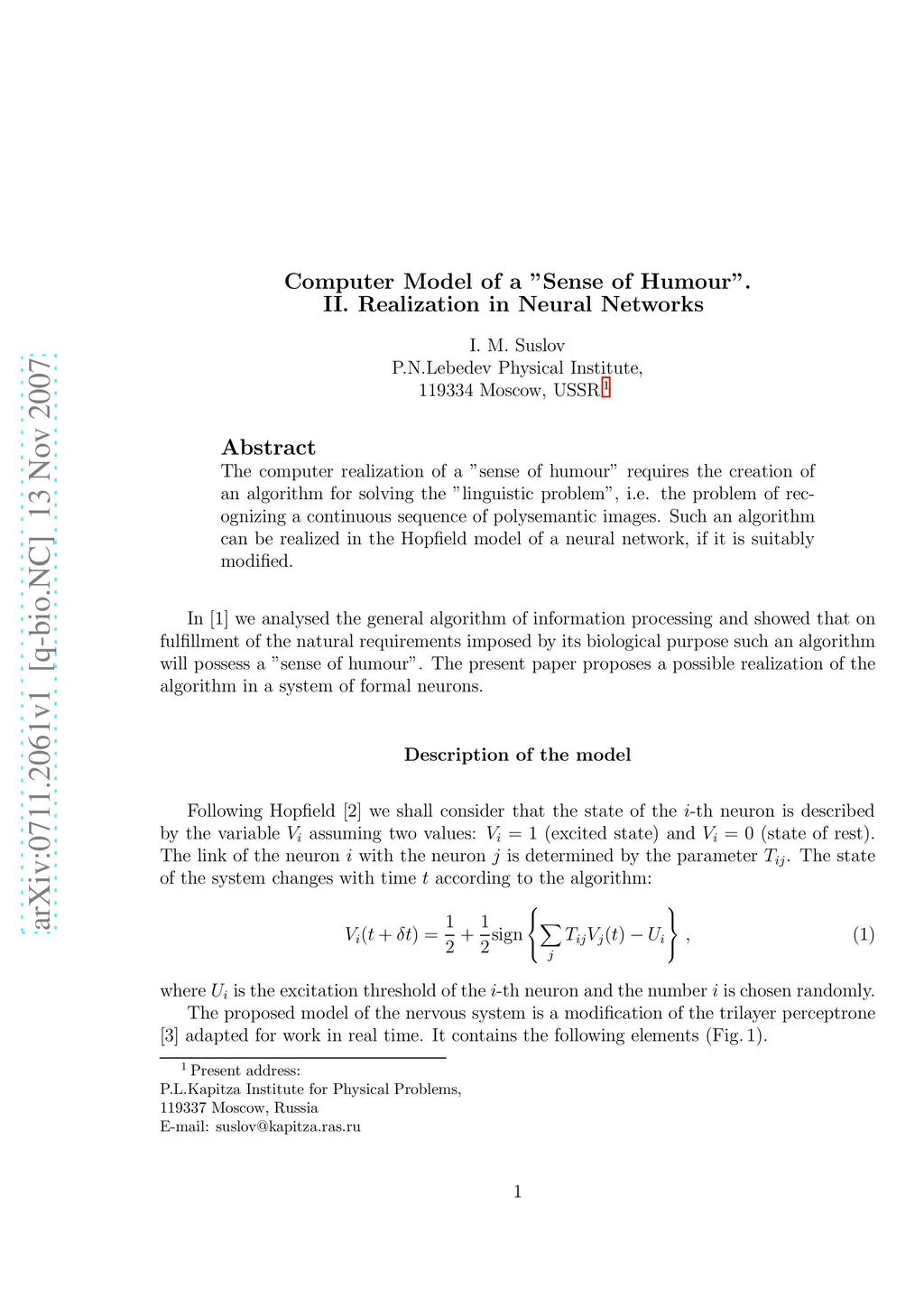 The computer realization of a "sense of humour" requires the creation of an algorithm for solving the "linguistic problem", i.e. the problem of recognizing a continuous sequence of polysemantic images. Such algorithm may be realized in the Hopfield model of a neural network after its proper modification.