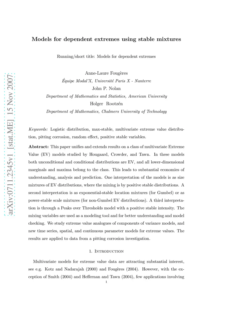 This paper unifies and extends results on a class of multivariate Extreme Value (EV) models studied by Hougaard, Crowder, and Tawn. In these models both unconditional and conditional distributions are EV, and all lower-dimensional marginals and maxima belong to the class. This leads to substantial economies of understanding, analysis and prediction. One interpretation of the models is as size mixtures of EV distributions, where the mixing is by positive stable distributions. A second interpretation is as exponential-stable location mixtures (for Gumbel) or as power-stable scale mixtures (for non-Gumbel EV distributions). A third interpretation is through a Peaks over Thresholds model with a positive stable intensity. The mixing variables are used as a modeling tool and for better understanding and model checking. We study extreme value analogues of components of variance models, and new time series, spatial, and continuous parameter models for extreme values. The results are applied to data from a pitting corrosion investigation.