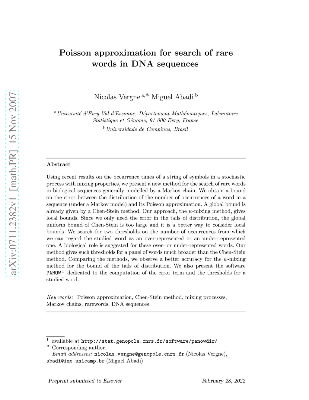 Using recent results on the occurrence times of a string of symbols in a stochastic process with mixing properties, we present a new method for the search of rare words in biological sequences generally modelled by a Markov chain. We obtain a bound on the error between the distribution of the number of occurrences of a word in a sequence (under a Markov model) and its Poisson approximation. A global bound is already given by a Chen-Stein method. Our approach, the psi-mixing method, gives local bounds. Since we only need the error in the tails of distribution, the global uniform bound of Chen-Stein is too large and it is a better way to consider local bounds. We search for two thresholds on the number of occurrences from which we can regard the studied word as an over-represented or an under-represented one. A biological role is suggested for these over- or under-represented words. Our method gives such thresholds for a panel of words much broader than the Chen-Stein method. Comparing the methods, we observe a better accuracy for the psi-mixing method for the bound of the tails of distribution. We also present the software PANOW (available at http://stat.genopole.cnrs.fr/software/panowdir/) dedicated to the computation of the error term and the thresholds for a studied word.