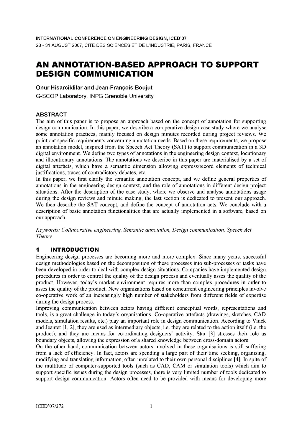 The aim of this paper is to propose an approach based on the concept of annotation for supporting design communication. In this paper, we describe a co-operative design case study where we analyse some annotation practices, mainly focused on design minutes recorded during project reviews. We point out specific requirements concerning annotation needs. Based on these requirements, we propose an annotation model, inspired from the Speech Act Theory (SAT) to support communication in a 3D digital environment. We define two types of annotations in the engineering design context, locutionary and illocutionary annotations. The annotations we describe in this paper are materialised by a set of digital artefacts, which have a semantic dimension allowing express/record elements of technical justifications, traces of contradictory debates, etc. In this paper, we first clarify the semantic annotation concept, and we define general properties of annotations in the engineering design context, and the role of annotations in different design project situations. After the description of the case study, where we observe and analyse annotations usage during the design reviews and minute making, the last section is dedicated to present our approach. We then describe the SAT concept, and define the concept of annotation acts. We conclude with a description of basic annotation functionalities that are actually implemented in a software, based on our approach.