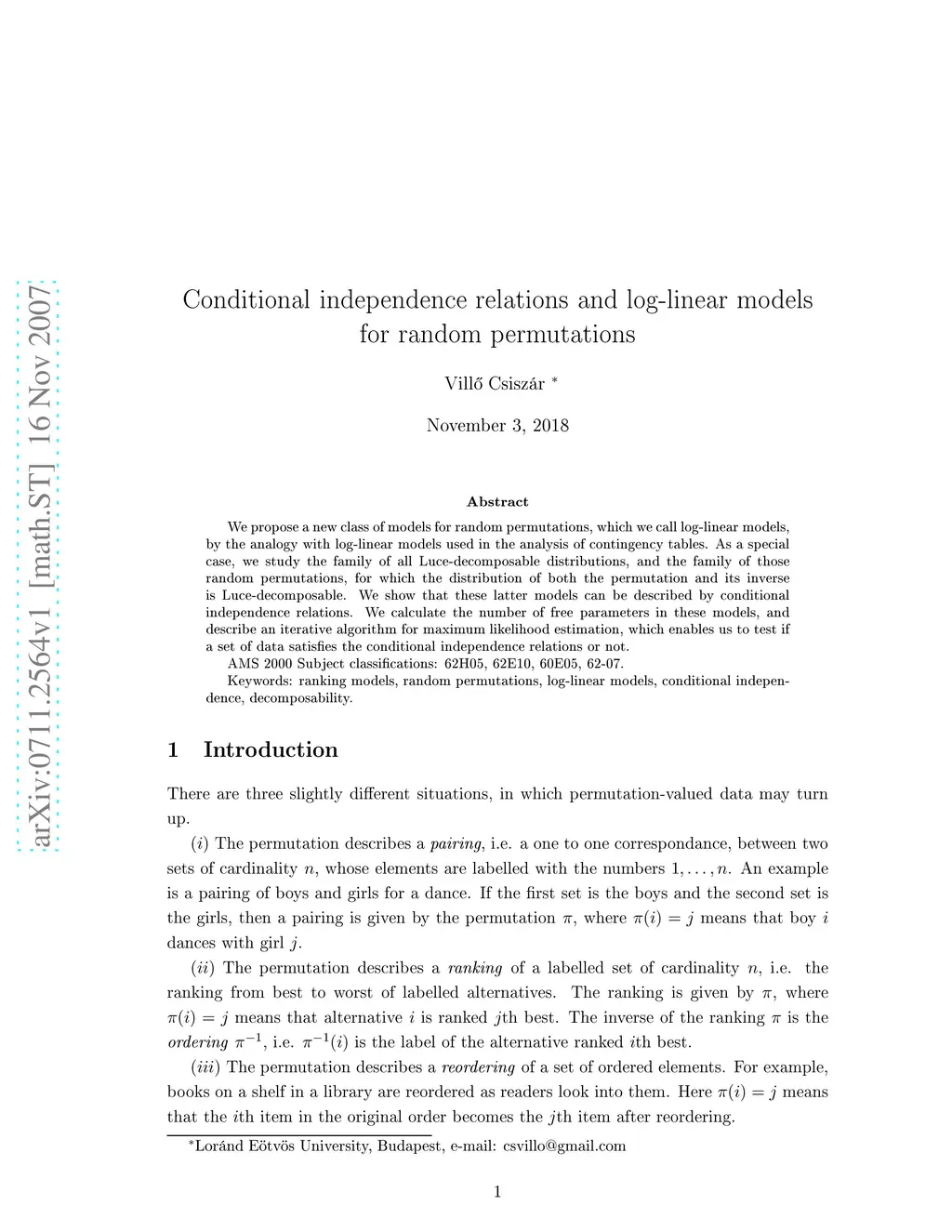 We propose a new class of models for random permutations, which we call log-linear models, by the analogy with log-linear models used in the analysis of contingency tables. As a special case, we study the family of all Luce-decomposable distributions, and the family of those random permutations, for which the distribution of both the permutation and its inverse is Luce-decomposable. We show that these latter models can be described by conditional independence relations. We calculate the number of free parameters in these models, and describe an iterative algorithm for maximum likelihood estimation, which enables us to test if a set of data satisfies the conditional independence relations or not.