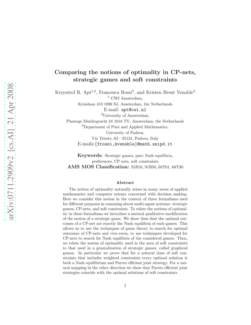 The notion of optimality naturally arises in many areas of applied mathematics and computer science concerned with decision making. Here we consider this notion in the context of three formalisms used for different purposes in reasoning about multi-agent systems: strategic games, CP-nets, and soft constraints. To relate the notions of optimality in these formalisms we introduce a natural qualitative modification of the notion of a strategic game. We show then that the optimal outcomes of a CP-net are exactly the Nash equilibria of such games. This allows us to use the techniques of game theory to search for optimal outcomes of CP-nets and vice-versa, to use techniques developed for CP-nets to search for Nash equilibria of the considered games. Then, we relate the notion of optimality used in the area of soft constraints to that used in a generalization of strategic games, called graphical games. In particular we prove that for a natural class of soft constraints that includes weighted constraints every optimal solution is both a Nash equilibrium and Pareto efficient joint strategy. For a natural mapping in the other direction we show that Pareto efficient joint strategies coincide with the optimal solutions of soft constraints.