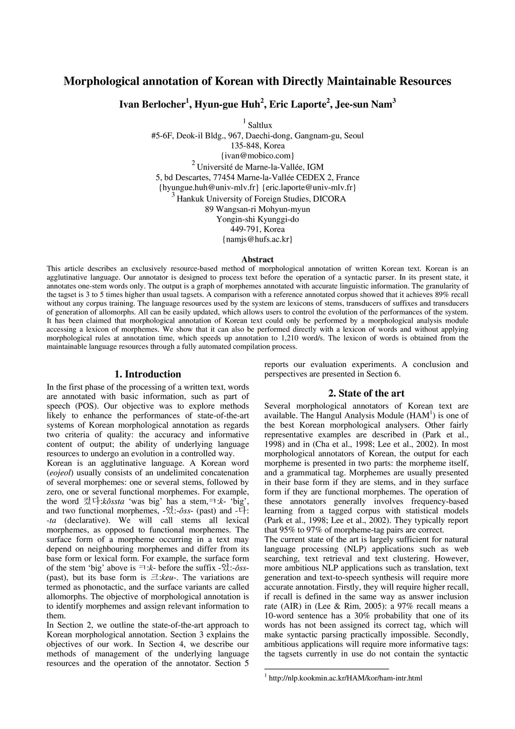 This article describes an exclusively resource-based method of morphological annotation of written Korean text. Korean is an agglutinative language. Our annotator is designed to process text before the operation of a syntactic parser. In its present state, it annotates one-stem words only. The output is a graph of morphemes annotated with accurate linguistic information. The granularity of the tagset is 3 to 5 times higher than usual tagsets. A comparison with a reference annotated corpus showed that it achieves 89% recall without any corpus training. The language resources used by the system are lexicons of stems, transducers of suffixes and transducers of generation of allomorphs. All can be easily updated, which allows users to control the evolution of the performances of the system. It has been claimed that morphological annotation of Korean text could only be performed by a morphological analysis module accessing a lexicon of morphemes. We show that it can also be performed directly with a lexicon of words and without applying morphological rules at annotation time, which speeds up annotation to 1,210 word/s. The lexicon of words is obtained from the maintainable language resources through a fully automated compilation process.