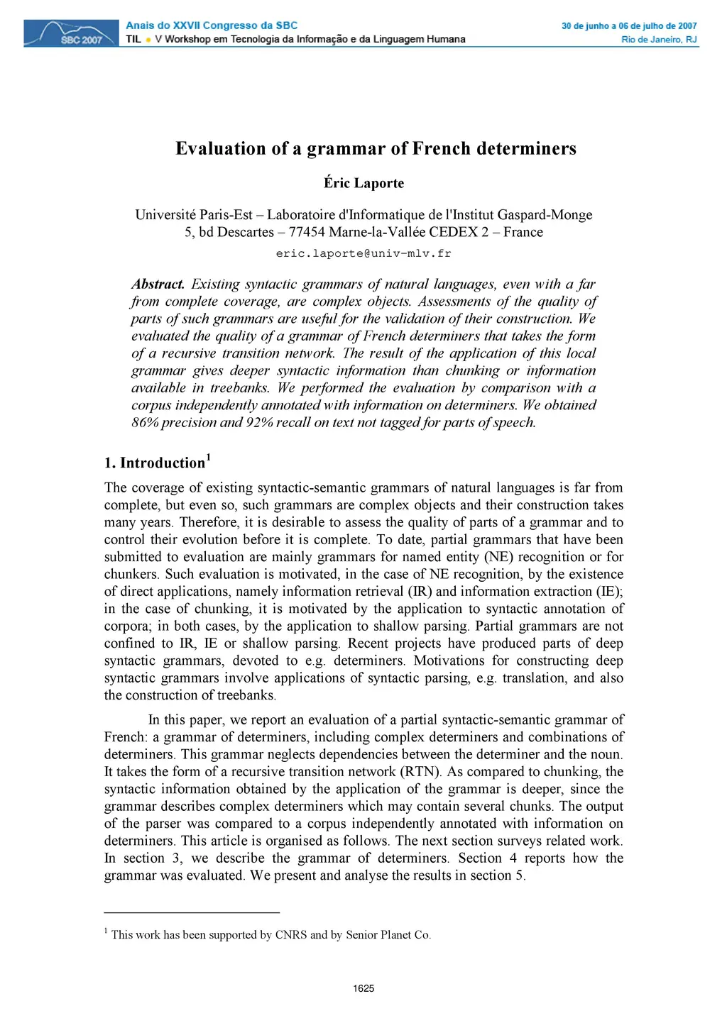 Evaluation of a Grammar of French Determiners