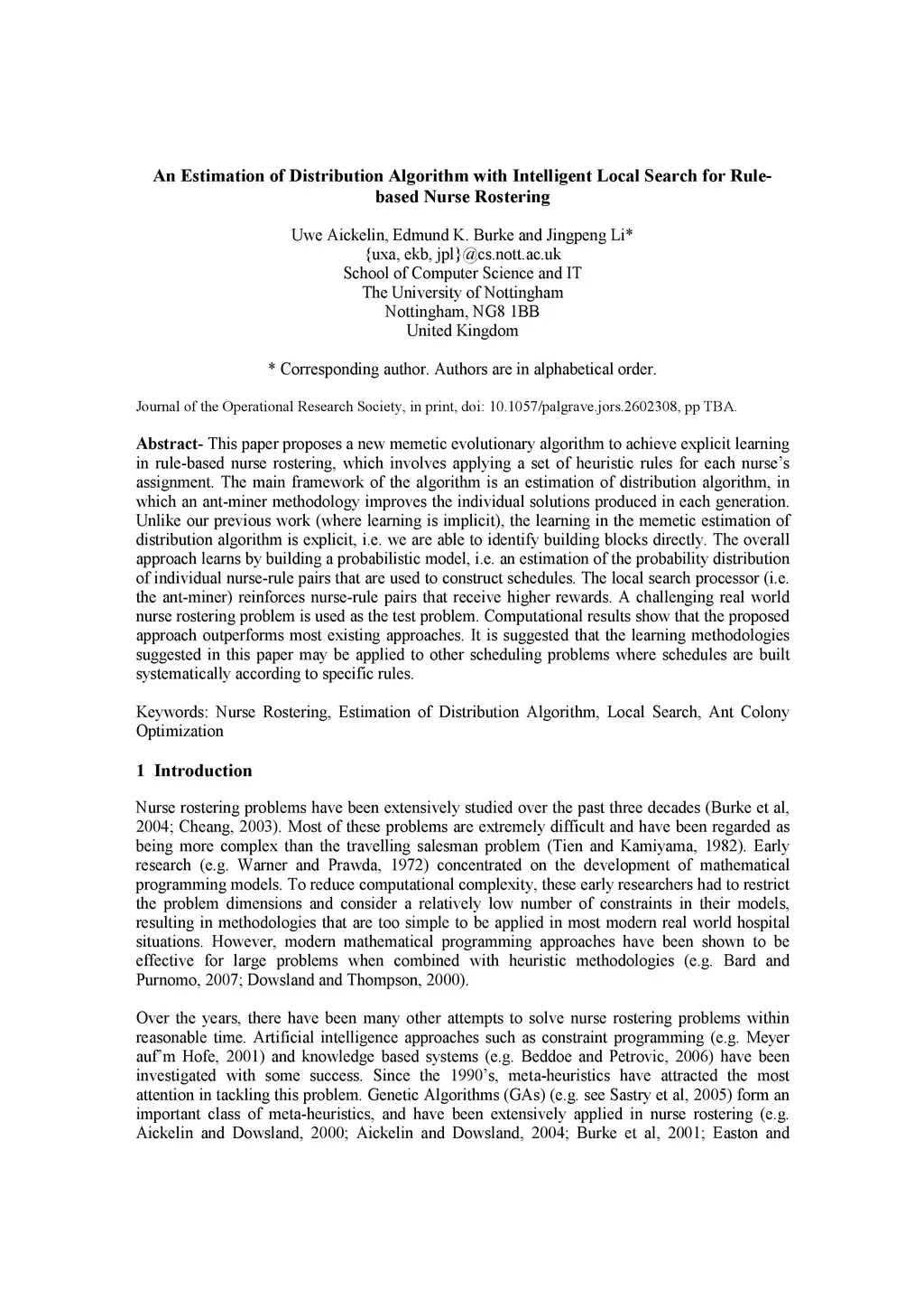 This paper proposes a new memetic evolutionary algorithm to achieve explicit learning in rule-based nurse rostering, which involves applying a set of heuristic rules for each nurse's assignment. The main framework of the algorithm is an estimation of distribution algorithm, in which an ant-miner methodology improves the individual solutions produced in each generation. Unlike our previous work (where learning is implicit), the learning in the memetic estimation of distribution algorithm is explicit, i.e. we are able to identify building blocks directly. The overall approach learns by building a probabilistic model, i.e. an estimation of the probability distribution of individual nurse-rule pairs that are used to construct schedules. The local search processor (i.e. the ant-miner) reinforces nurse-rule pairs that receive higher rewards. A challenging real world nurse rostering problem is used as the test problem. Computational results show that the proposed approach outperforms most existing approaches. It is suggested that the learning methodologies suggested in this paper may be applied to other scheduling problems where schedules are built systematically according to specific rules