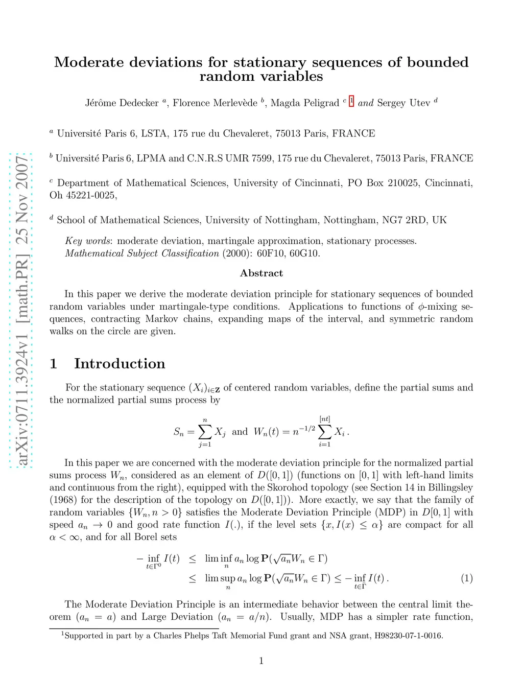 In this paper we derive the moderate deviation principle for stationary sequences of bounded random variables under martingale-type conditions. Applications to functions of -mixing sequences, contracting Markov chains, expanding maps of the interval, and symmetric random walks on the circle are given.