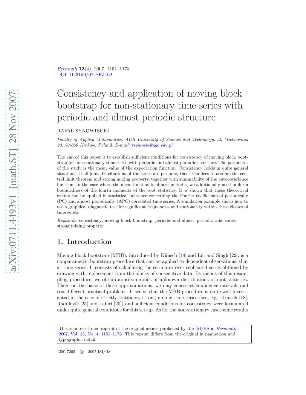 The aim of this paper it to establish sufficient conditions for consistency of moving block bootstrap for non-stationary time series with periodic and almost periodic structure. The parameter of the study is the mean value of the expectation function. Consistency holds in quite general situations: if all joint distributions of the series are periodic, then it suffices to assume the central limit theorem and strong mixing property, together with summability of the autocovariance function. In the case where the mean function is almost periodic, we additionally need uniform boundedness of the fourth moments of the root statistics. It is shown that these theoretical results can be applied in statistical inference concerning the Fourier coefficients of periodically (PC) and almost periodically (APC) correlated time series. A simulation example shows how to use a graphical diagnostic test for significant frequencies and stationarity within these classes of time series.