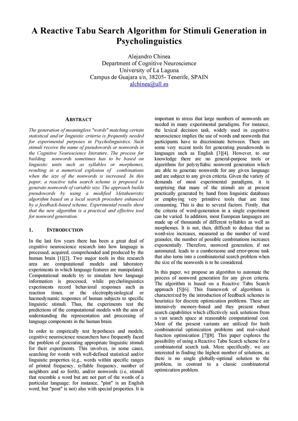 The generation of meaningless "words" matching certain statistical and/or linguistic criteria is frequently needed for experimental purposes in Psycholinguistics. Such stimuli receive the name of pseudowords or nonwords in the Cognitive Neuroscience literatue. The process for building nonwords sometimes has to be based on linguistic units such as syllables or morphemes, resulting in a numerical explosion of combinations when the size of the nonwords is increased. In this paper, a reactive tabu search scheme is proposed to generate nonwords of variables size. The approach builds pseudowords by using a modified Metaheuristic algorithm based on a local search procedure enhanced by a feedback-based scheme. Experimental results show that the new algorithm is a practical and effective tool for nonword generation.