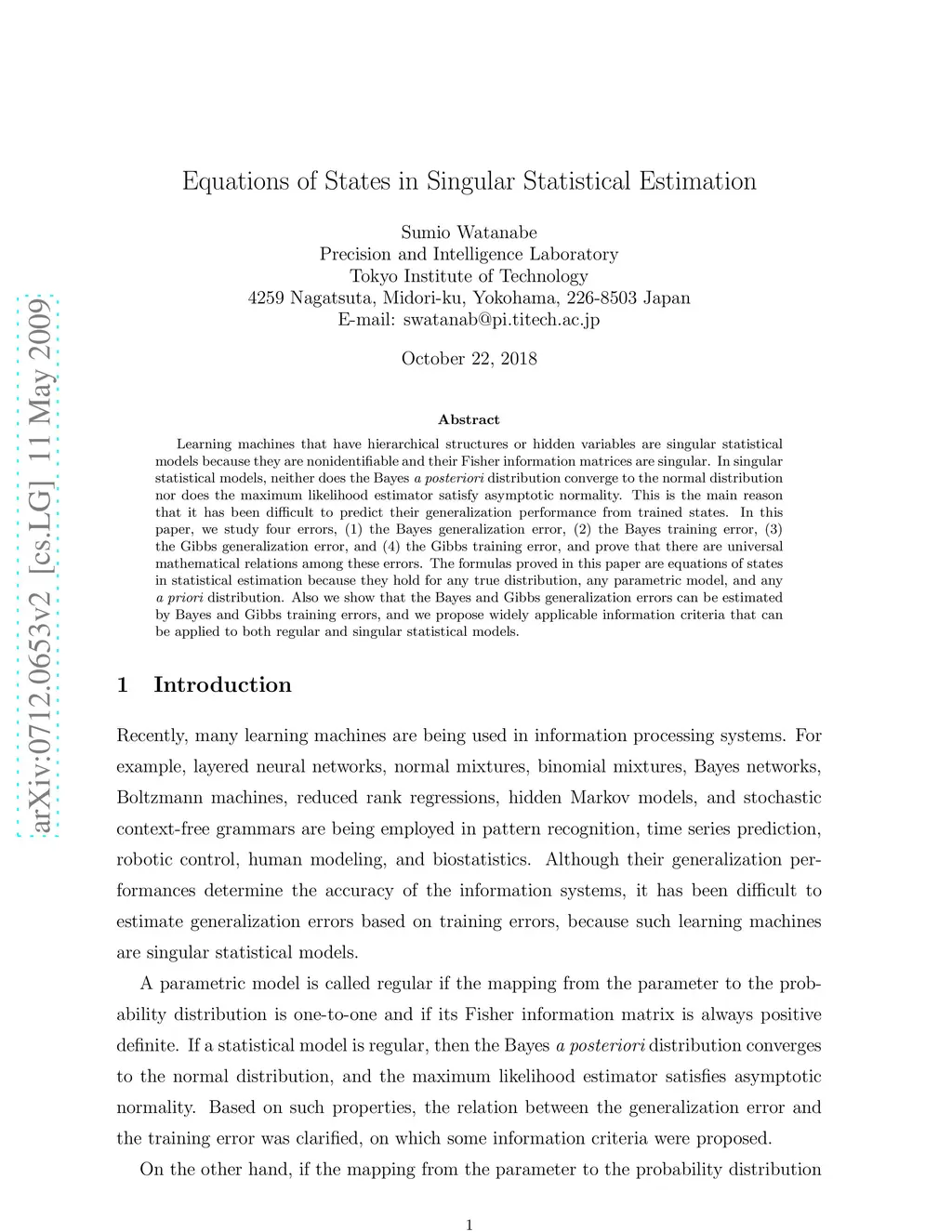 Learning machines which have hierarchical structures or hidden variables are singular statistical models because they are nonidentifiable and their Fisher information matrices are singular. In singular statistical models, neither the Bayes a posteriori distribution converges to the normal distribution nor the maximum likelihood estimator satisfies asymptotic normality. This is the main reason why it has been difficult to predict their generalization performances from trained states. In this paper, we study four errors, (1) Bayes generalization error, (2) Bayes training error, (3) Gibbs generalization error, and (4) Gibbs training error, and prove that there are mathematical relations among these errors. The formulas proved in this paper are equations of states in statistical estimation because they hold for any true distribution, any parametric model, and any a priori distribution. Also we show that Bayes and Gibbs generalization errors are estimated by Bayes and Gibbs training errors, and propose widely applicable information criteria which can be applied to both regular and singular statistical models.