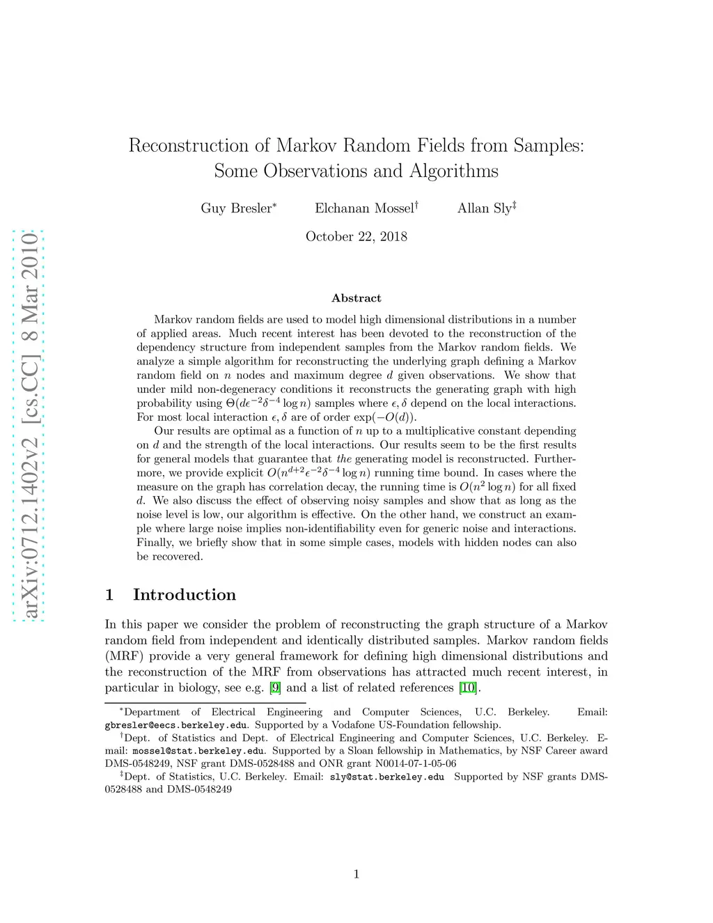 Markov random fields are used to model high dimensional distributions in a number of applied areas. Much recent interest has been devoted to the reconstruction of the dependency structure from independent samples from the Markov random fields. We analyze a simple algorithm for reconstructing the underlying graph defining a Markov random field on nodes and maximum degree given observations. We show that under mild non-degeneracy conditions it reconstructs the generating graph with high probability using samples where depend on the local interactions. For most local interaction are of order . Our results are optimal as a function of up to a multiplicative constant depending on and the strength of the local interactions. Our results seem to be the first results for general models that guarantee that {\em the} generating model is reconstructed. Furthermore, we provide explicit running time bound. In cases where the measure on the graph has correlation decay, the running time is for all fixed . We also discuss the effect of observing noisy samples and show that as long as the noise level is low, our algorithm is effective. On the other hand, we construct an example where large noise implies non-identifiability even for generic noise and interactions. Finally, we briefly show that in some simple cases, models with hidden nodes can also be recovered.