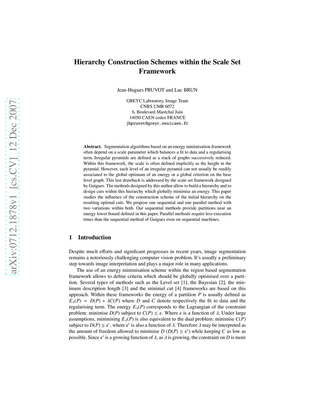 Segmentation algorithms based on an energy minimisation framework often depend on a scale parameter which balances a fit to data and a regularising term. Irregular pyramids are defined as a stack of graphs successively reduced. Within this framework, the scale is often defined implicitly as the height in the pyramid. However, each level of an irregular pyramid can not usually be readily associated to the global optimum of an energy or a global criterion on the base level graph. This last drawback is addressed by the scale set framework designed by Guigues. The methods designed by this author allow to build a hierarchy and to design cuts within this hierarchy which globally minimise an energy. This paper studies the influence of the construction scheme of the initial hierarchy on the resulting optimal cuts. We propose one sequential and one parallel method with two variations within both. Our sequential methods provide partitions near the global optima while parallel methods require less execution times than the sequential method of Guigues even on sequential machines.