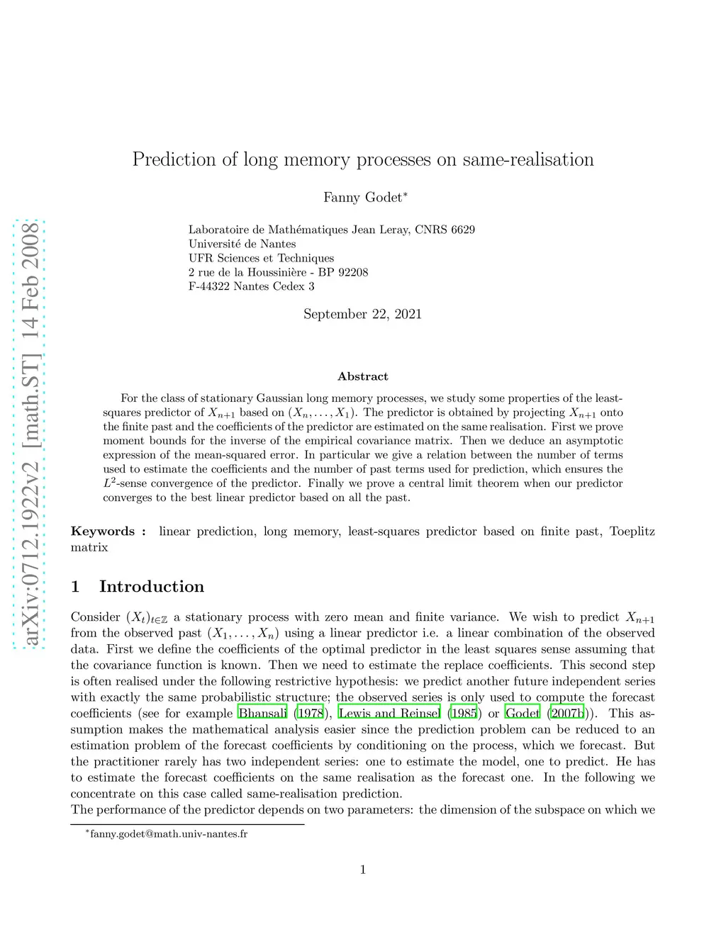For the class of stationary Gaussian long memory processes, we study some properties of the least-squares predictor of X_{n+1} based on (X_n, ..., X_1). The predictor is obtained by projecting X_{n+1} onto the finite past and the coefficients of the predictor are estimated on the same realisation. First we prove moment bounds for the inverse of the empirical covariance matrix. Then we deduce an asymptotic expression of the mean-squared error. In particular we give a relation between the number of terms used to estimate the coefficients and the number of past terms used for prediction, which ensures the L^2-sense convergence of the predictor. Finally we prove a central limit theorem when our predictor converges to the best linear predictor based on all the past.