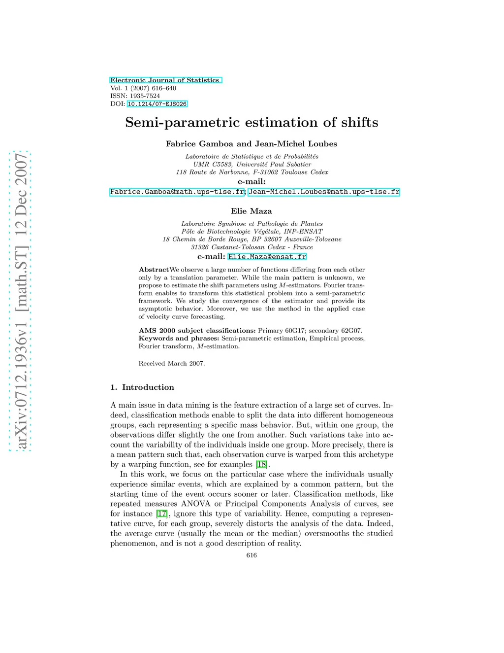 We observe a large number of functions differing from each other only by a translation parameter. While the main pattern is unknown, we propose to estimate the shift parameters using -estimators. Fourier transform enables to transform this statistical problem into a semi-parametric framework. We study the convergence of the estimator and provide its asymptotic behavior. Moreover, we use the method in the applied case of velocity curve forecasting.