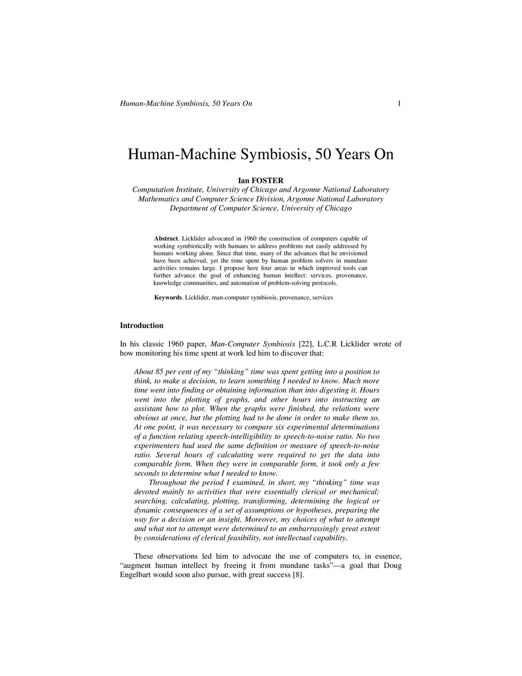 Licklider advocated in 1960 the construction of computers capable of working symbiotically with humans to address problems not easily addressed by humans working alone. Since that time, many of the advances that he envisioned have been achieved, yet the time spent by human problem solvers in mundane activities remains large. I propose here four areas in which improved tools can further advance the goal of enhancing human intellect: services, provenance, knowledge communities, and automation of problem-solving protocols.