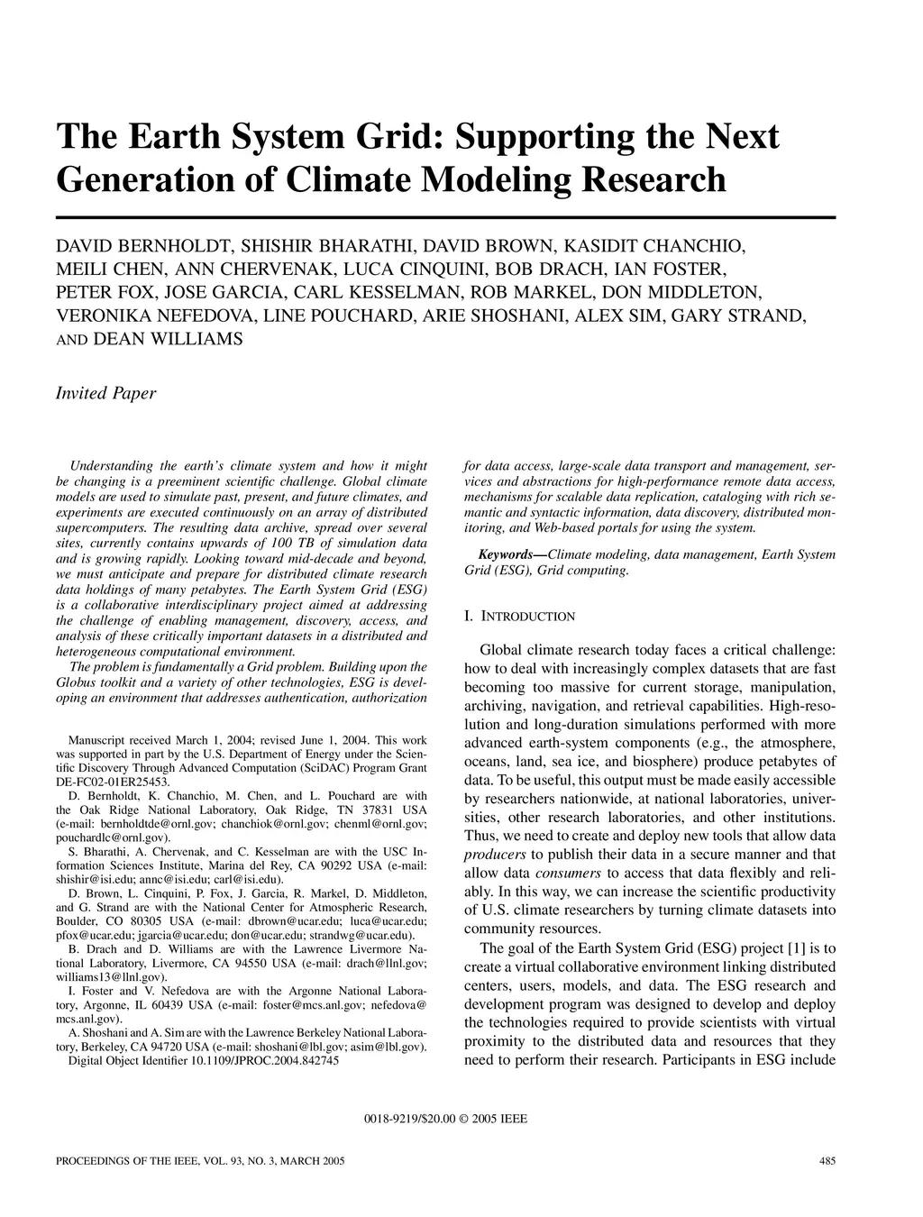 Understanding the earth's climate system and how it might be changing is a preeminent scientific challenge. Global climate models are used to simulate past, present, and future climates, and experiments are executed continuously on an array of distributed supercomputers. The resulting data archive, spread over several sites, currently contains upwards of 100 TB of simulation data and is growing rapidly. Looking toward mid-decade and beyond, we must anticipate and prepare for distributed climate research data holdings of many petabytes. The Earth System Grid (ESG) is a collaborative interdisciplinary project aimed at addressing the challenge of enabling management, discovery, access, and analysis of these critically important datasets in a distributed and heterogeneous computational environment. The problem is fundamentally a Grid problem. Building upon the Globus toolkit and a variety of other technologies, ESG is developing an environment that addresses authentication, authorization for data access, large-scale data transport and management, services and abstractions for high-performance remote data access, mechanisms for scalable data replication, cataloging with rich semantic and syntactic information, data discovery, distributed monitoring, and Web-based portals for using the system.