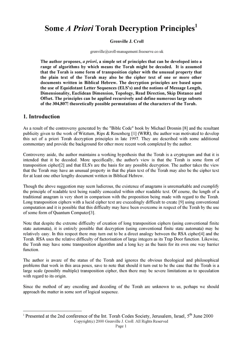 The author proposes, a priori, a simple set of principles that can be developed into a range of algorithms by which means the Torah might be decoded. It is assumed that the Torah is some form of transposition cipher with the unusual property that the plain text of the Torah may also be the cipher text of one or more other documents written in Biblical Hebrew. The decryption principles are based upon the use of Equidistant Letter Sequences (ELS) and the notions of Message Length, Dimensionality, Euclidean Dimension, Topology, Read Direction, Skip Distance and offset. The principles can be applied recursively and define numerous large subsets of the 304,807! theoretically possible permutations of the characters of the Torah.