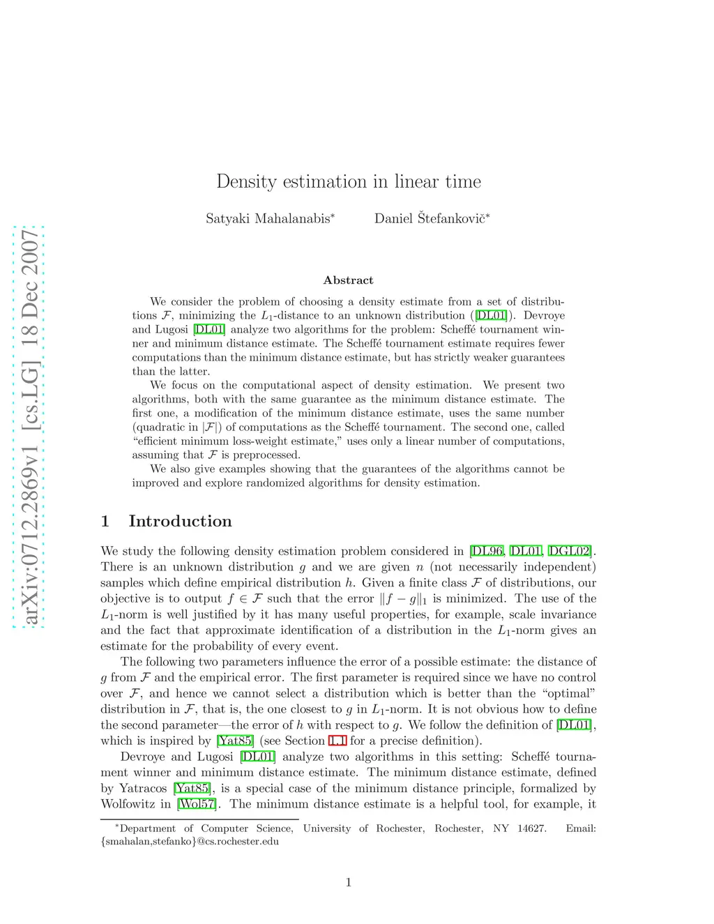 We consider the problem of choosing a density estimate from a set of distributions F, minimizing the L1-distance to an unknown distribution (Devroye, Lugosi 2001). Devroye and Lugosi analyze two algorithms for the problem: Scheffe tournament winner and minimum distance estimate. The Scheffe tournament estimate requires fewer computations than the minimum distance estimate, but has strictly weaker guarantees than the latter. We focus on the computational aspect of density estimation. We present two algorithms, both with the same guarantee as the minimum distance estimate. The first one, a modification of the minimum distance estimate, uses the same number (quadratic in |F|) of computations as the Scheffe tournament. The second one, called ``efficient minimum loss-weight estimate,'' uses only a linear number of computations, assuming that F is preprocessed. We also give examples showing that the guarantees of the algorithms cannot be improved and explore randomized algorithms for density estimation.