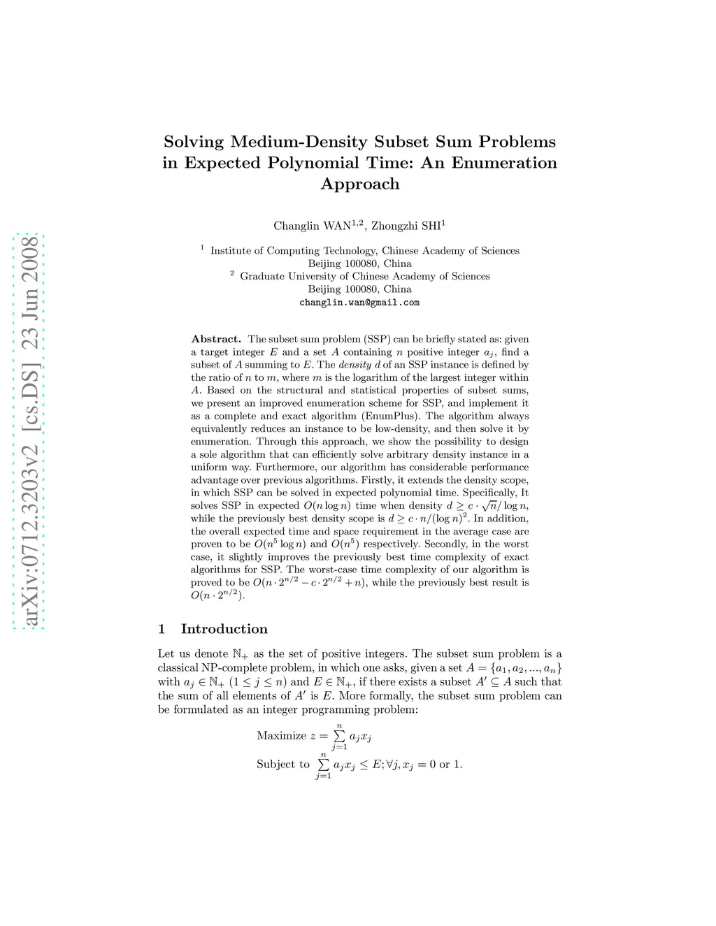 The subset sum problem (SSP) can be briefly stated as: given a target integer and a set containing positive integer , find a subset of summing to . The \textit{density} of an SSP instance is defined by the ratio of to , where is the logarithm of the largest integer within . Based on the structural and statistical properties of subset sums, we present an improved enumeration scheme for SSP, and implement it as a complete and exact algorithm (EnumPlus). The algorithm always equivalently reduces an instance to be low-density, and then solve it by enumeration. Through this approach, we show the possibility to design a sole algorithm that can efficiently solve arbitrary density instance in a uniform way. Furthermore, our algorithm has considerable performance advantage over previous algorithms. Firstly, it extends the density scope, in which SSP can be solved in expected polynomial time. Specifically, It solves SSP in expected time when density , while the previously best density scope is . In addition, the overall expected time and space requirement in the average case are proven to be and respectively. Secondly, in the worst case, it slightly improves the previously best time complexity of exact algorithms for SSP. Specifically, the worst-case time complexity of our algorithm is proved to be , while the previously best result is .