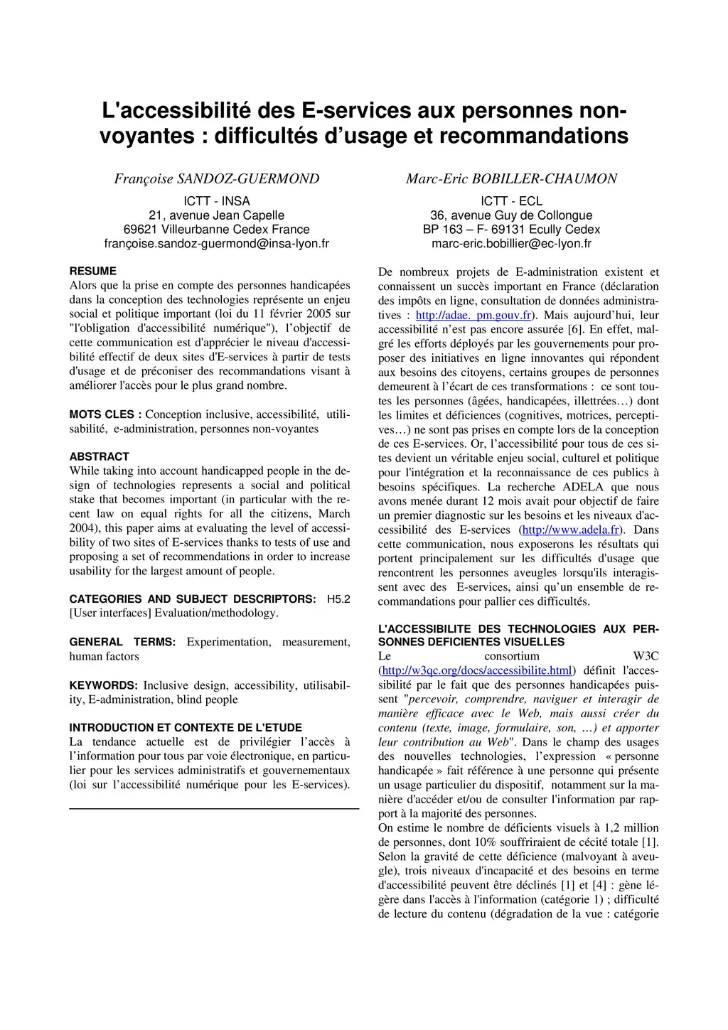 While taking into account handicapped people in the design of technologies represents a social and political stake that becomes important (in particular with the recent law on equal rights for all the citizens, March 2004), this paper aims at evaluating the level of accessibility of two sites of E-services thanks to tests of use and proposing a set of recommendations in order to increase usability for the largest amount of people.