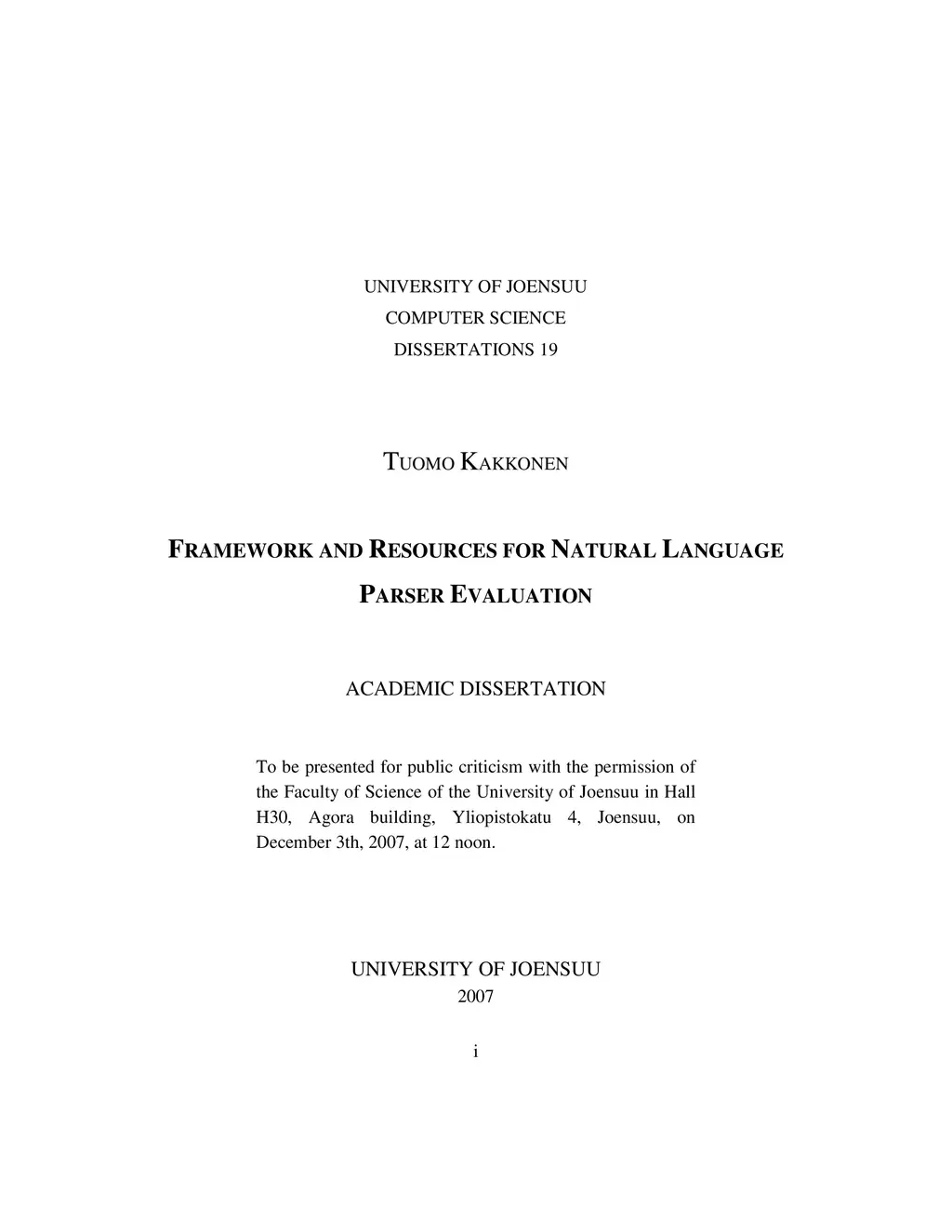 Because of the wide variety of contemporary practices used in the automatic syntactic parsing of natural languages, it has become necessary to analyze and evaluate the strengths and weaknesses of different approaches. This research is all the more necessary because there are currently no genre- and domain-independent parsers that are able to analyze unrestricted text with 100% preciseness (I use this term to refer to the correctness of analyses assigned by a parser). All these factors create a need for methods and resources that can be used to evaluate and compare parsing systems. This research describes: (1) A theoretical analysis of current achievements in parsing and parser evaluation. (2) A framework (called FEPa) that can be used to carry out practical parser evaluations and comparisons. (3) A set of new evaluation resources: FiEval is a Finnish treebank under construction, and MGTS and RobSet are parser evaluation resources in English. (4) The results of experiments in which the developed evaluation framework and the two resources for English were used for evaluating a set of selected parsers.