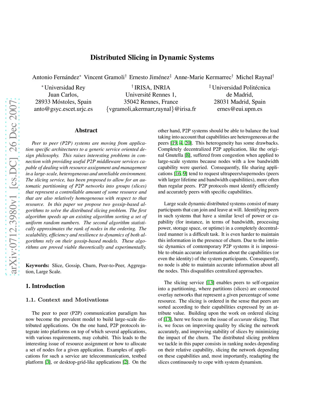 Peer to peer (P2P) systems are moving from application specific architectures to a generic service oriented design philosophy. This raises interesting problems in connection with providing useful P2P middleware services capable of dealing with resource assignment and management in a large-scale, heterogeneous and unreliable environment. The slicing service, has been proposed to allow for an automatic partitioning of P2P networks into groups (slices) that represent a controllable amount of some resource and that are also relatively homogeneous with respect to that resource. In this paper we propose two gossip-based algorithms to solve the distributed slicing problem. The first algorithm speeds up an existing algorithm sorting a set of uniform random numbers. The second algorithm statistically approximates the rank of nodes in the ordering. The scalability, efficiency and resilience to dynamics of both algorithms rely on their gossip-based models. These algorithms are proved viable theoretically and experimentally.