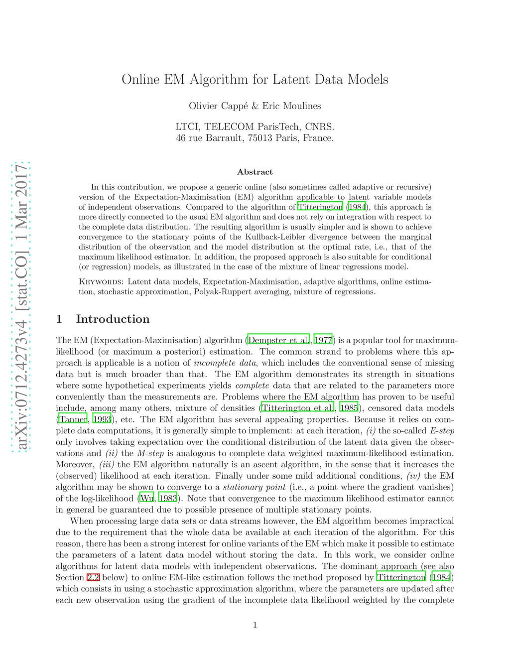In this contribution, we propose a generic online (also sometimes called adaptive or recursive) version of the Expectation-Maximisation (EM) algorithm applicable to latent variable models of independent observations. Compared to the algorithm of Titterington (1984), this approach is more directly connected to the usual EM algorithm and does not rely on integration with respect to the complete data distribution. The resulting algorithm is usually simpler and is shown to achieve convergence to the stationary points of the Kullback-Leibler divergence between the marginal distribution of the observation and the model distribution at the optimal rate, i.e., that of the maximum likelihood estimator. In addition, the proposed approach is also suitable for conditional (or regression) models, as illustrated in the case of the mixture of linear regressions model.
