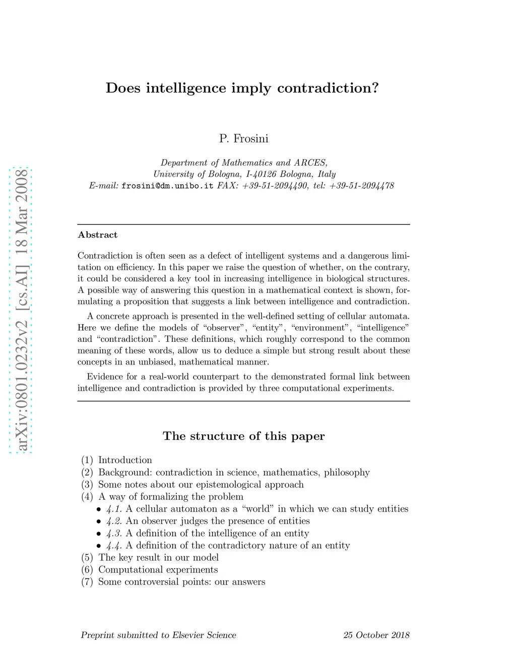 Contradiction is often seen as a defect of intelligent systems and a dangerous limitation on efficiency. In this paper we raise the question of whether, on the contrary, it could be considered a key tool in increasing intelligence in biological structures. A possible way of answering this question in a mathematical context is shown, formulating a proposition that suggests a link between intelligence and contradiction. A concrete approach is presented in the well-defined setting of cellular automata. Here we define the models of ``observer'', ``entity'', ``environment'', ``intelligence'' and ``contradiction''. These definitions, which roughly correspond to the common meaning of these words, allow us to deduce a simple but strong result about these concepts in an unbiased, mathematical manner. Evidence for a real-world counterpart to the demonstrated formal link between intelligence and contradiction is provided by three computational experiments.