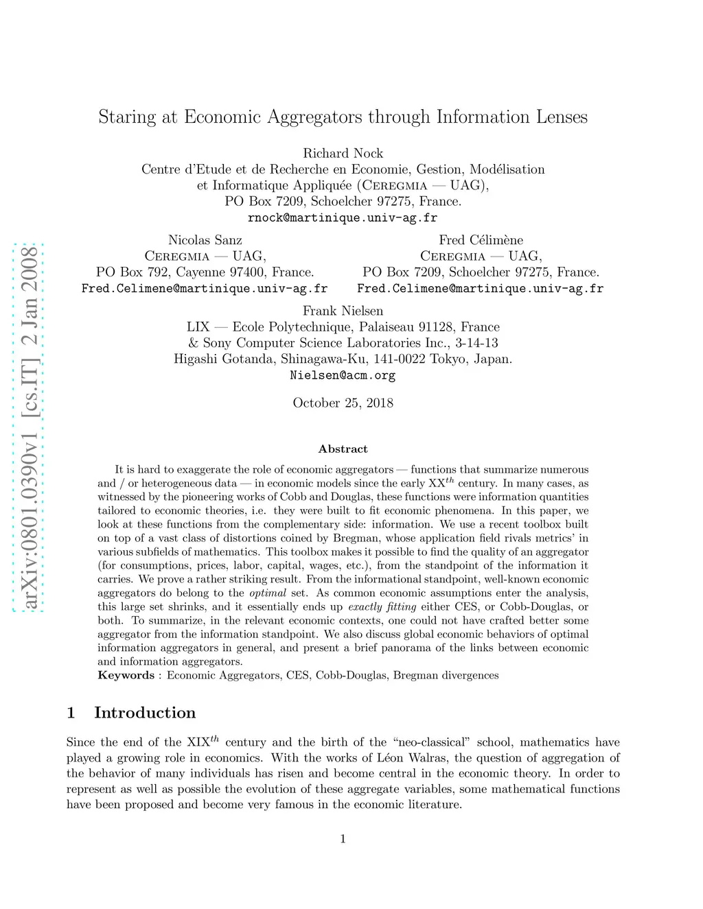 It is hard to exaggerate the role of economic aggregators -- functions that summarize numerous and / or heterogeneous data -- in economic models since the early XX century. In many cases, as witnessed by the pioneering works of Cobb and Douglas, these functions were information quantities tailored to economic theories, i.e. they were built to fit economic phenomena. In this paper, we look at these functions from the complementary side: information. We use a recent toolbox built on top of a vast class of distortions coined by Bregman, whose application field rivals metrics' in various subfields of mathematics. This toolbox makes it possible to find the quality of an aggregator (for consumptions, prices, labor, capital, wages, etc.), from the standpoint of the information it carries. We prove a rather striking result. From the informational standpoint, well-known economic aggregators do belong to the \textit{optimal} set. As common economic assumptions enter the analysis, this large set shrinks, and it essentially ends up \textit{exactly fitting} either CES, or Cobb-Douglas, or both. To summarize, in the relevant economic contexts, one could not have crafted better some aggregator from the information standpoint. We also discuss global economic behaviors of optimal information aggregators in general, and present a brief panorama of the links between economic and information aggregators. Keywords: Economic Aggregators, CES, Cobb-Douglas, Bregman divergences