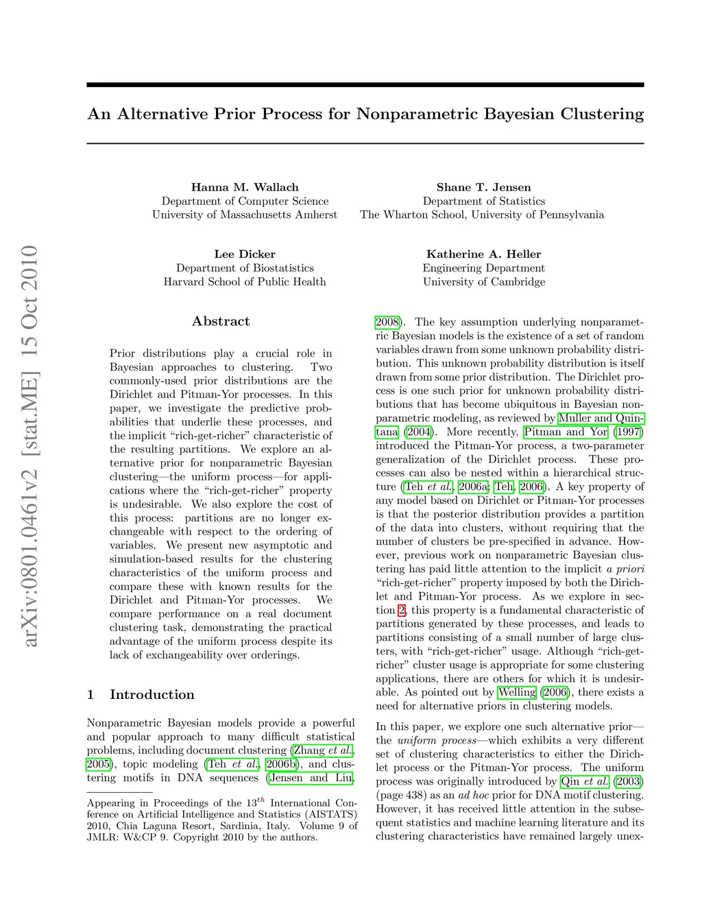 Prior distributions play a crucial role in Bayesian approaches to clustering. Two commonly-used prior distributions are the Dirichlet and Pitman-Yor processes. In this paper, we investigate the predictive probabilities that underlie these processes, and the implicit "rich-get-richer" characteristic of the resulting partitions. We explore an alternative prior for nonparametric Bayesian clustering -- the uniform process -- for applications where the "rich-get-richer" property is undesirable. We also explore the cost of this process: partitions are no longer exchangeable with respect to the ordering of variables. We present new asymptotic and simulation-based results for the clustering characteristics of the uniform process and compare these with known results for the Dirichlet and Pitman-Yor processes. We compare performance on a real document clustering task, demonstrating the practical advantage of the uniform process despite its lack of exchangeability over orderings.