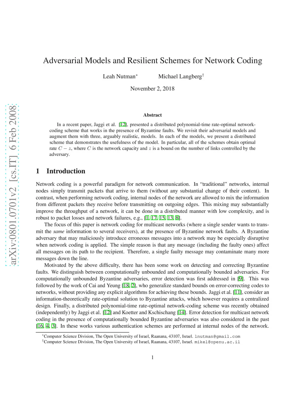 In a recent paper, Jaggi et al. (INFOCOM 2007), presented a distributed polynomial-time rate-optimal network-coding scheme that works in the presence of Byzantine faults. We revisit their adversarial models and augment them with three, arguably realistic, models. In each of the models, we present a distributed scheme that demonstrates the usefulness of the model. In particular, all of the schemes obtain optimal rate , where is the network capacity and is a bound on the number of links controlled by the adversary.