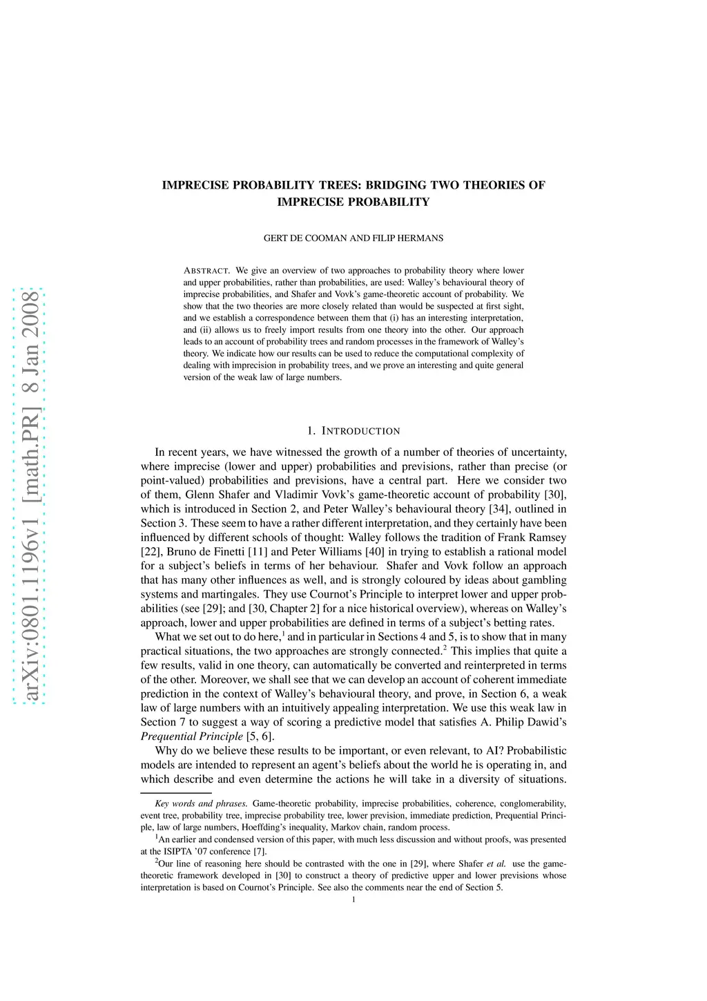 We give an overview of two approaches to probability theory where lower and upper probabilities, rather than probabilities, are used: Walley's behavioural theory of imprecise probabilities, and Shafer and Vovk's game-theoretic account of probability. We show that the two theories are more closely related than would be suspected at first sight, and we establish a correspondence between them that (i) has an interesting interpretation, and (ii) allows us to freely import results from one theory into the other. Our approach leads to an account of probability trees and random processes in the framework of Walley's theory. We indicate how our results can be used to reduce the computational complexity of dealing with imprecision in probability trees, and we prove an interesting and quite general version of the weak law of large numbers.