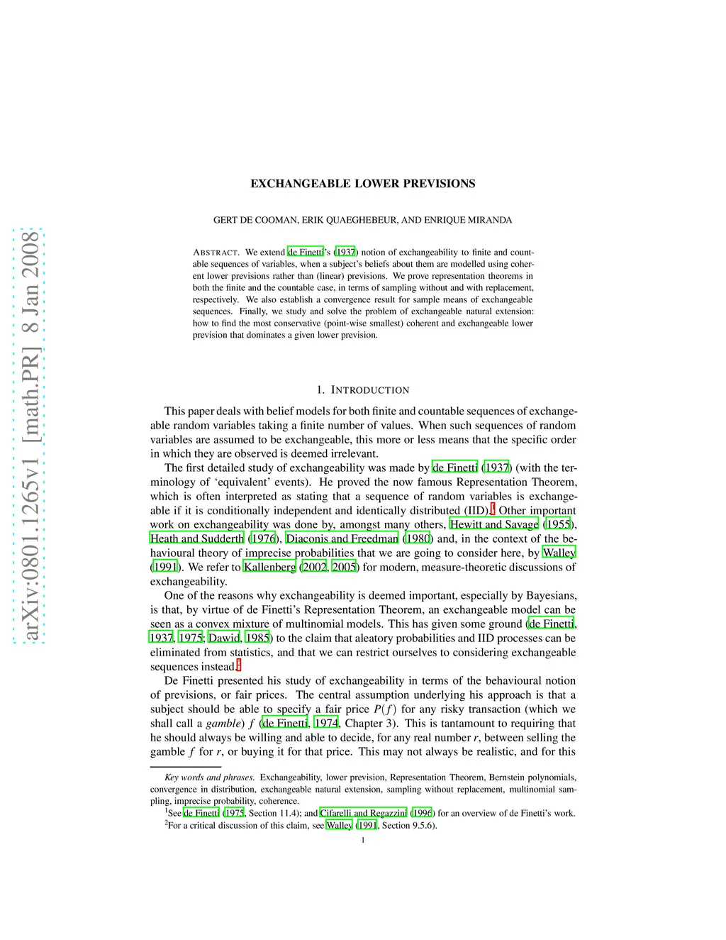 We extend de Finetti's (1937) notion of exchangeability to finite and countable sequences of variables, when a subject's beliefs about them are modelled using coherent lower previsions rather than (linear) previsions. We prove representation theorems in both the finite and the countable case, in terms of sampling without and with replacement, respectively. We also establish a convergence result for sample means of exchangeable sequences. Finally, we study and solve the problem of exchangeable natural extension: how to find the most conservative (point-wise smallest) coherent and exchangeable lower prevision that dominates a given lower prevision.