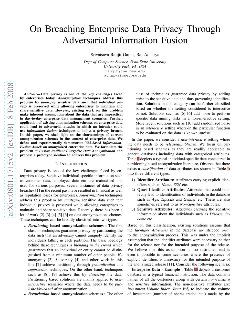 Data privacy is one of the key challenges faced by enterprises today. Anonymization techniques address this problem by sanitizing sensitive data such that individual privacy is preserved while allowing enterprises to maintain and share sensitive data. However, existing work on this problem make inherent assumptions about the data that are impractical in day-to-day enterprise data management scenarios. Further, application of existing anonymization schemes on enterprise data could lead to adversarial attacks in which an intruder could use information fusion techniques to inflict a privacy breach. In this paper, we shed light on the shortcomings of current anonymization schemes in the context of enterprise data. We define and experimentally demonstrate Web-based Information- Fusion Attack on anonymized enterprise data. We formulate the problem of Fusion Resilient Enterprise Data Anonymization and propose a prototype solution to address this problem.