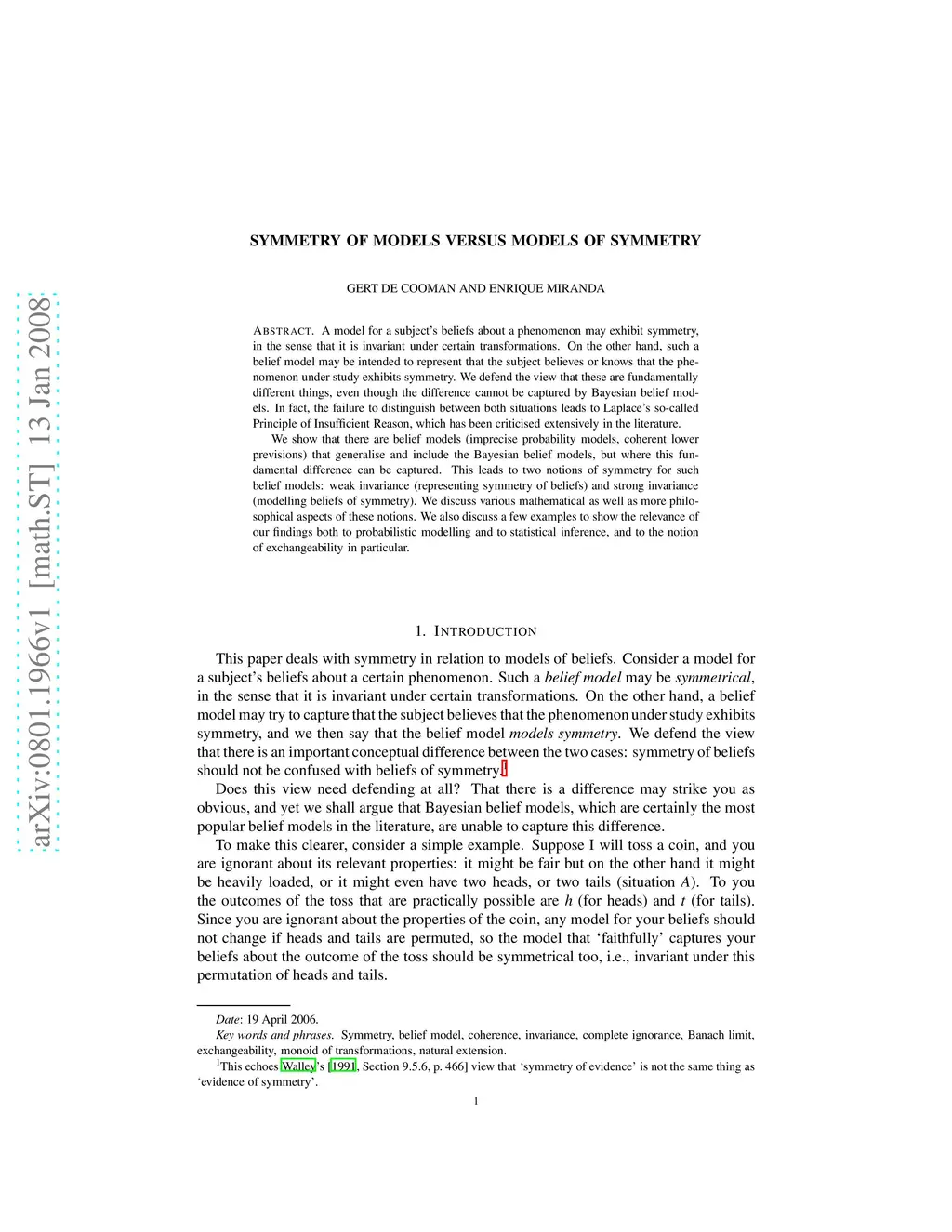 A model for a subject's beliefs about a phenomenon may exhibit symmetry, in the sense that it is invariant under certain transformations. On the other hand, such a belief model may be intended to represent that the subject believes or knows that the phenomenon under study exhibits symmetry. We defend the view that these are fundamentally different things, even though the difference cannot be captured by Bayesian belief models. In fact, the failure to distinguish between both situations leads to Laplace's so-called Principle of Insufficient Reason, which has been criticised extensively in the literature. We show that there are belief models (imprecise probability models, coherent lower previsions) that generalise and include the Bayesian belief models, but where this fundamental difference can be captured. This leads to two notions of symmetry for such belief models: weak invariance (representing symmetry of beliefs) and strong invariance (modelling beliefs of symmetry). We discuss various mathematical as well as more philosophical aspects of these notions. We also discuss a few examples to show the relevance of our findings both to probabilistic modelling and to statistical inference, and to the notion of exchangeability in particular.