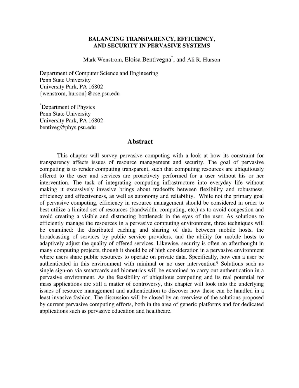 This chapter will survey pervasive computing with a look at how its constraint for transparency affects issues of resource management and security. The goal of pervasive computing is to render computing transparent, such that computing resources are ubiquitously offered to the user and services are proactively performed for a user without his or her intervention. The task of integrating computing infrastructure into everyday life without making it excessively invasive brings about tradeoffs between flexibility and robustness, efficiency and effectiveness, as well as autonomy and reliability. As the feasibility of ubiquitous computing and its real potential for mass applications are still a matter of controversy, this chapter will look into the underlying issues of resource management and authentication to discover how these can be handled in a least invasive fashion. The discussion will be closed by an overview of the solutions proposed by current pervasive computing efforts, both in the area of generic platforms and for dedicated applications such as pervasive education and healthcare.