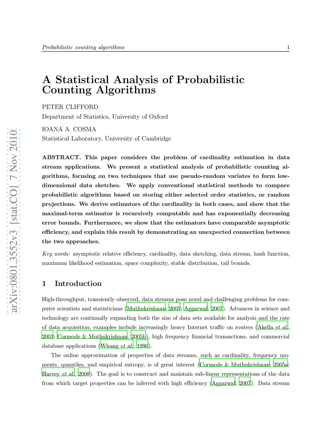 This paper considers the problem of cardinality estimation in data stream applications. We present a statistical analysis of probabilistic counting algorithms, focusing on two techniques that use pseudo-random variates to form low-dimensional data sketches. We apply conventional statistical methods to compare probabilistic algorithms based on storing either selected order statistics, or random projections. We derive estimators of the cardinality in both cases, and show that the maximal-term estimator is recursively computable and has exponentially decreasing error bounds. Furthermore, we show that the estimators have comparable asymptotic efficiency, and explain this result by demonstrating an unexpected connection between the two approaches.