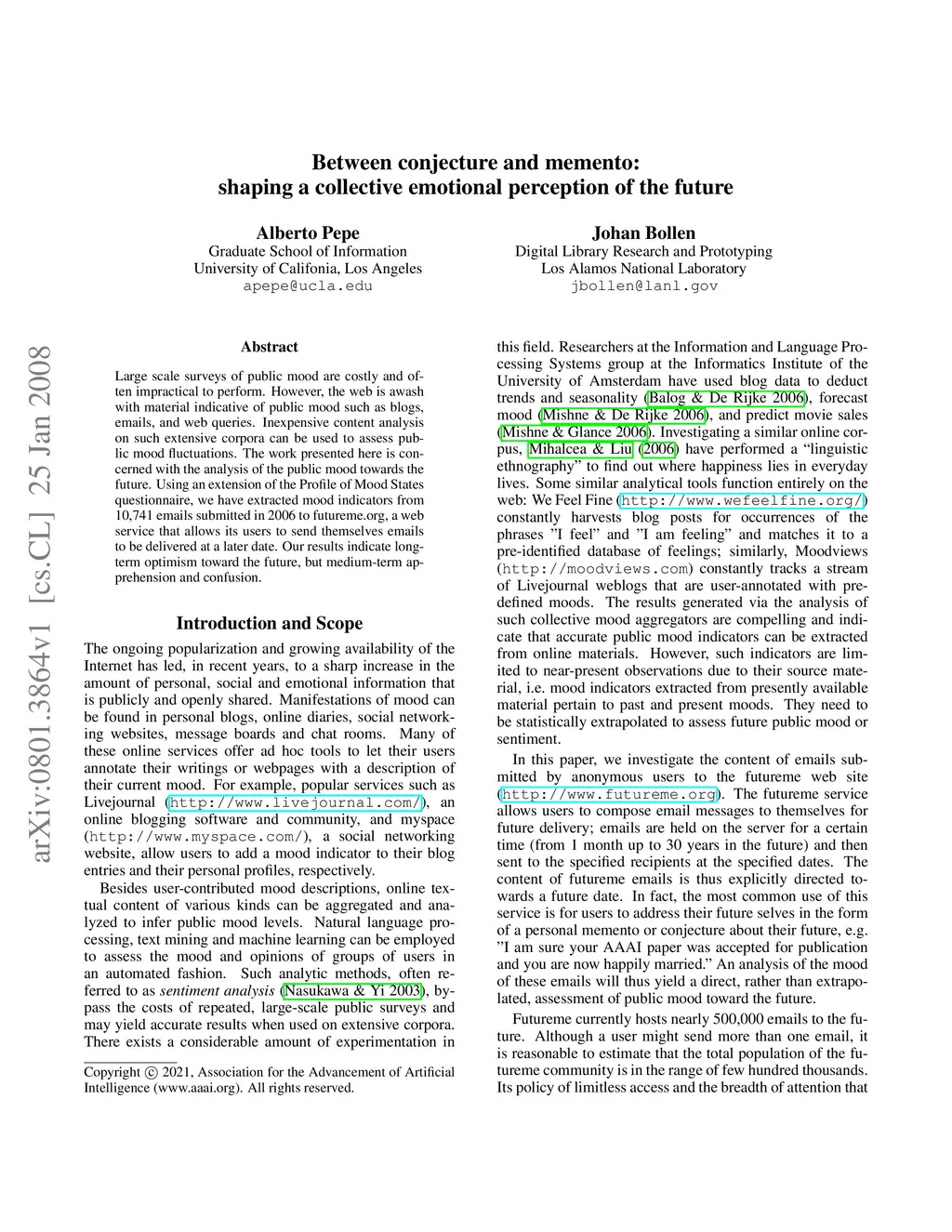 Large scale surveys of public mood are costly and often impractical to perform. However, the web is awash with material indicative of public mood such as blogs, emails, and web queries. Inexpensive content analysis on such extensive corpora can be used to assess public mood fluctuations. The work presented here is concerned with the analysis of the public mood towards the future. Using an extension of the Profile of Mood States questionnaire, we have extracted mood indicators from 10,741 emails submitted in 2006 to futureme.org, a web service that allows its users to send themselves emails to be delivered at a later date. Our results indicate long-term optimism toward the future, but medium-term apprehension and confusion.