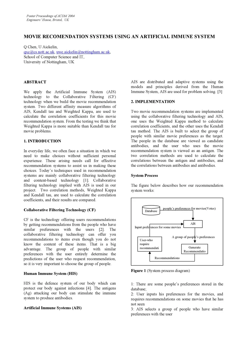 We apply the Artificial Immune System (AIS) technology to the Collaborative Filtering (CF) technology when we build the movie recommendation system. Two different affinity measure algorithms of AIS, Kendall tau and Weighted Kappa, are used to calculate the correlation coefficients for this movie recommendation system. From the testing we think that Weighted Kappa is more suitable than Kendall tau for movie problems.