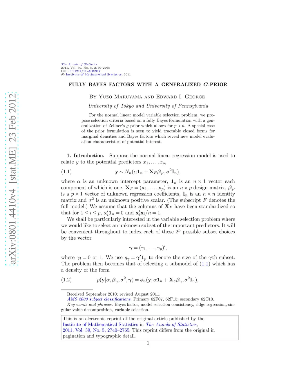 For the normal linear model variable selection problem, we propose selection criteria based on a fully Bayes formulation with a generalization of Zellner's -prior which allows for . A special case of the prior formulation is seen to yield tractable closed forms for marginal densities and Bayes factors which reveal new model evaluation characteristics of potential interest.