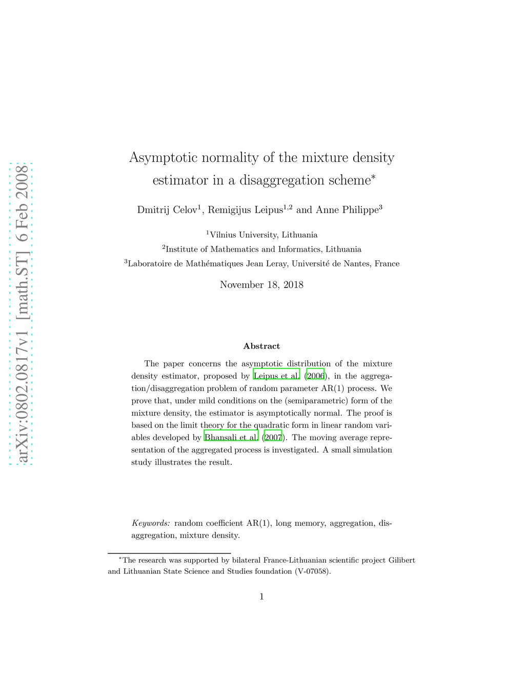 The paper concerns the asymptotic distribution of the mixture density estimator, proposed by Oppenheim et al 2006, in the aggregation/disaggregation problem of random parameter AR(1) process. We prove that, under mild conditions on the (semiparametric) form of the mixture density, the estimator is asymptotically normal. The proof is based on the limit theory for the quadratic form in linear random variables developed by Bhansali et al 2007. The moving average representation of the aggregated process is investigated. A small simulation study illustrates the result.